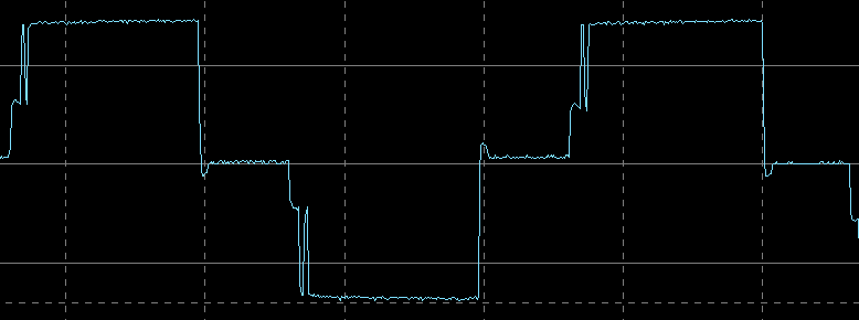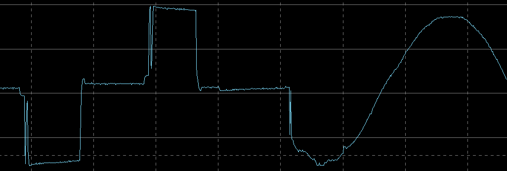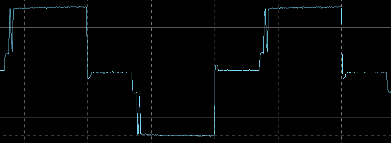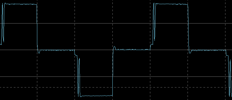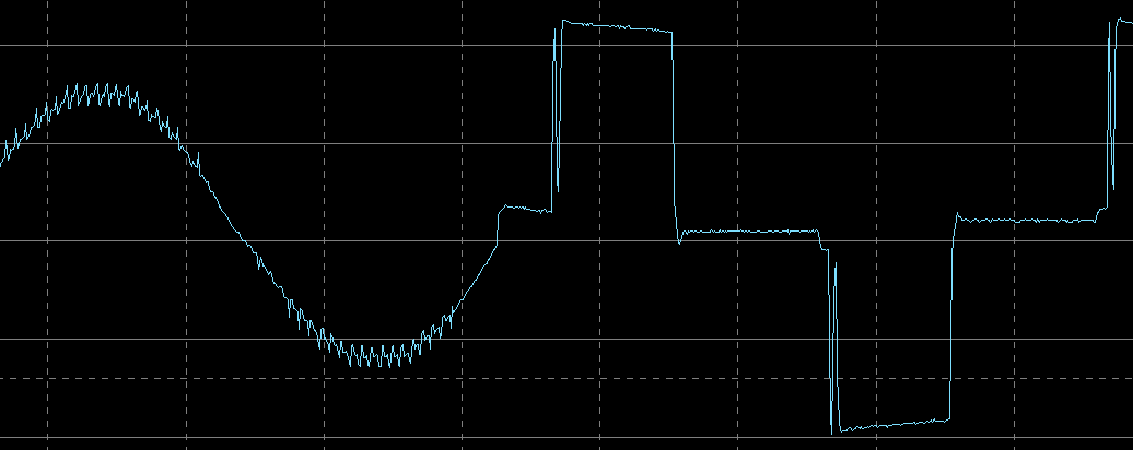 Выходное напряжение при работе от батареи — вполне обычная для подобных ИБП «модифицированная синусоида», ничего общего с синусоидой не имеющая, но вполне пригодная для работы c нагрузками, оснащенными импульсными блоками питания.