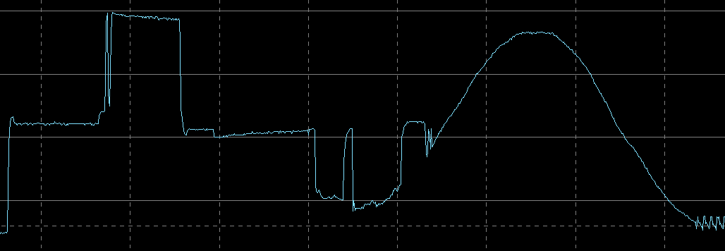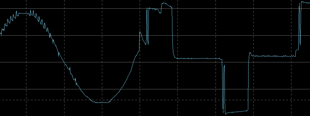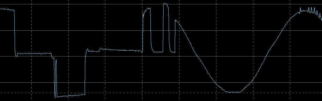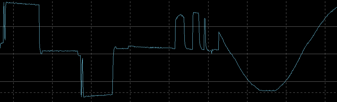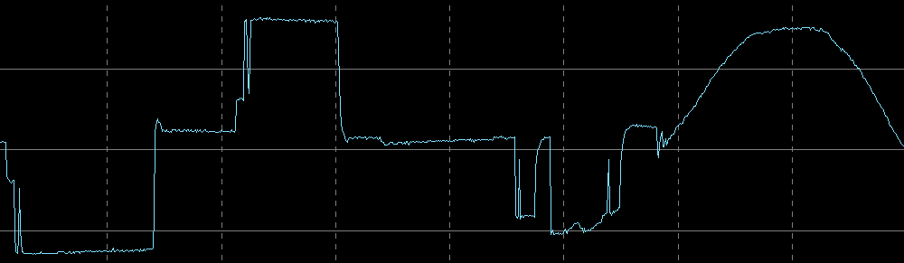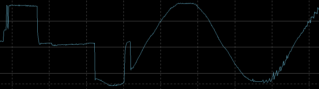 Снова плавное понижение, сначала следует переход с инвертора на понижающую обмотку, а затем и на прямую трансляцию: