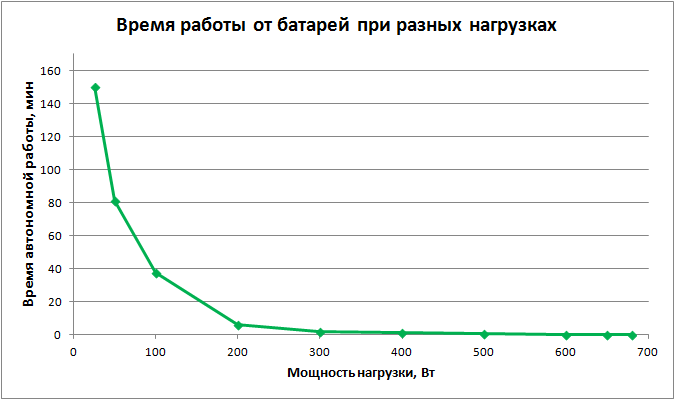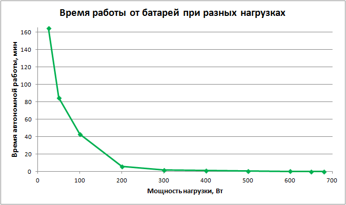 | Нагрузка, Вт | Время работы от батарей, ч:мм:сс | |
