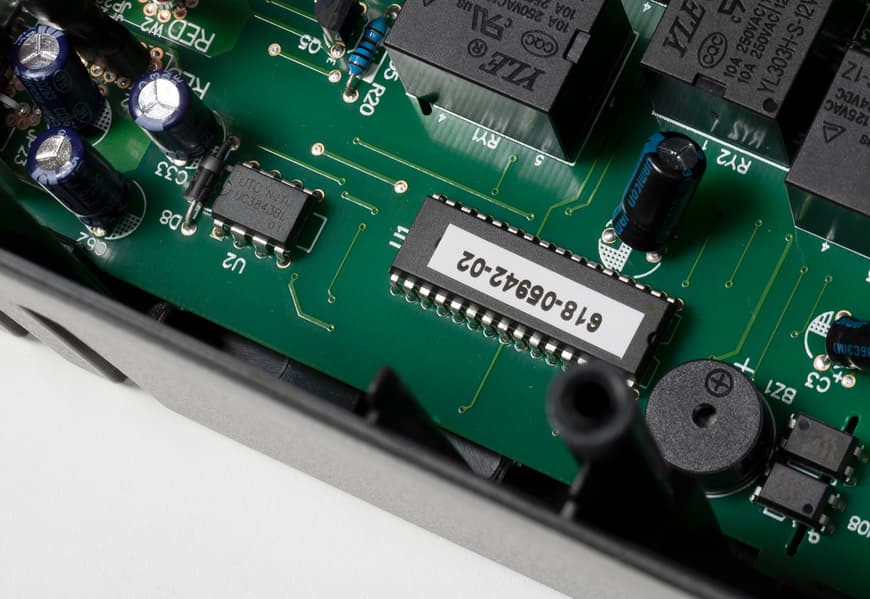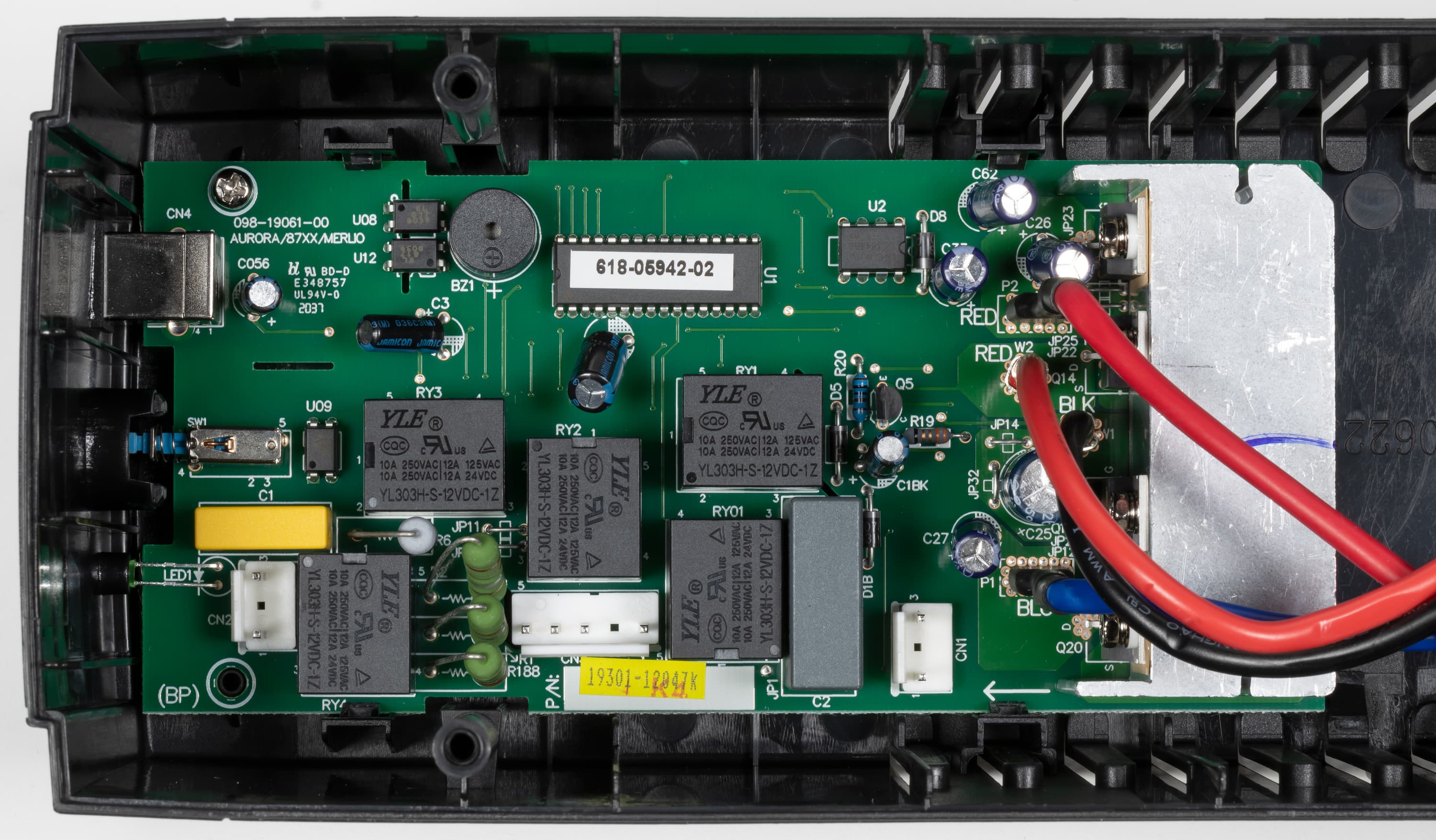 Коммутация осуществляется пятью реле YLE YL303H-S-12VDC-1Z, защита от импульсных помех содержит только конденсатор. Многоразового автоматического предохранителя, срабатывающего при коротком замыкании или перегрузке, или хотя бы плавкой вставки, в конструкции нет.