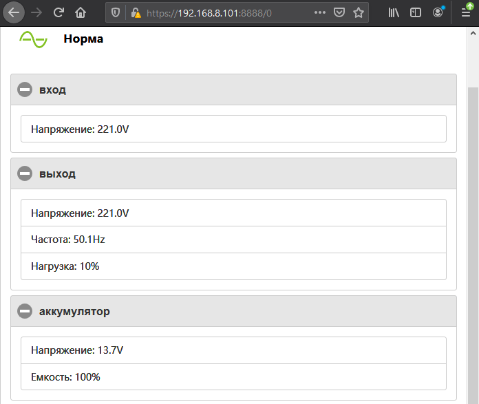 Кроме того, можно воспользоваться веб-интерфейсом, для чего нужно в настройках Winpower запустить веб-сервер — собственно, это сделано по умолчанию. И тогда, обратившись через порт 8888 к IP-адресу компьютера, к которому подключен ИБП (но надо либо отключить брандмауэр, либо открыть этот порт), получим ту же информацию, что и в Winpower, хоть и в менее наглядном текстовом виде. Для управления источником потребуется ввести пароль администратора, но доступные настройки здесь и вовсе сводятся к запуску самотестирования.