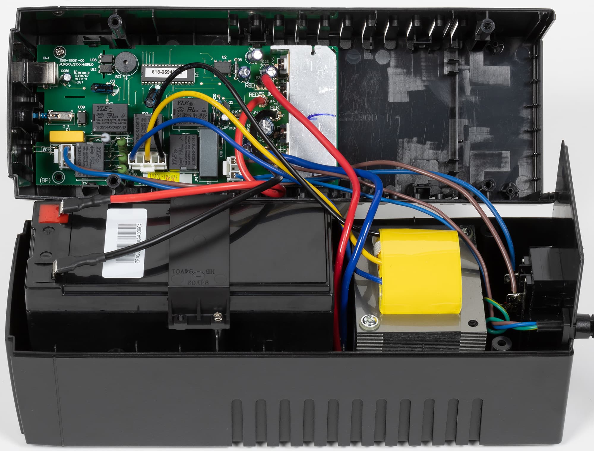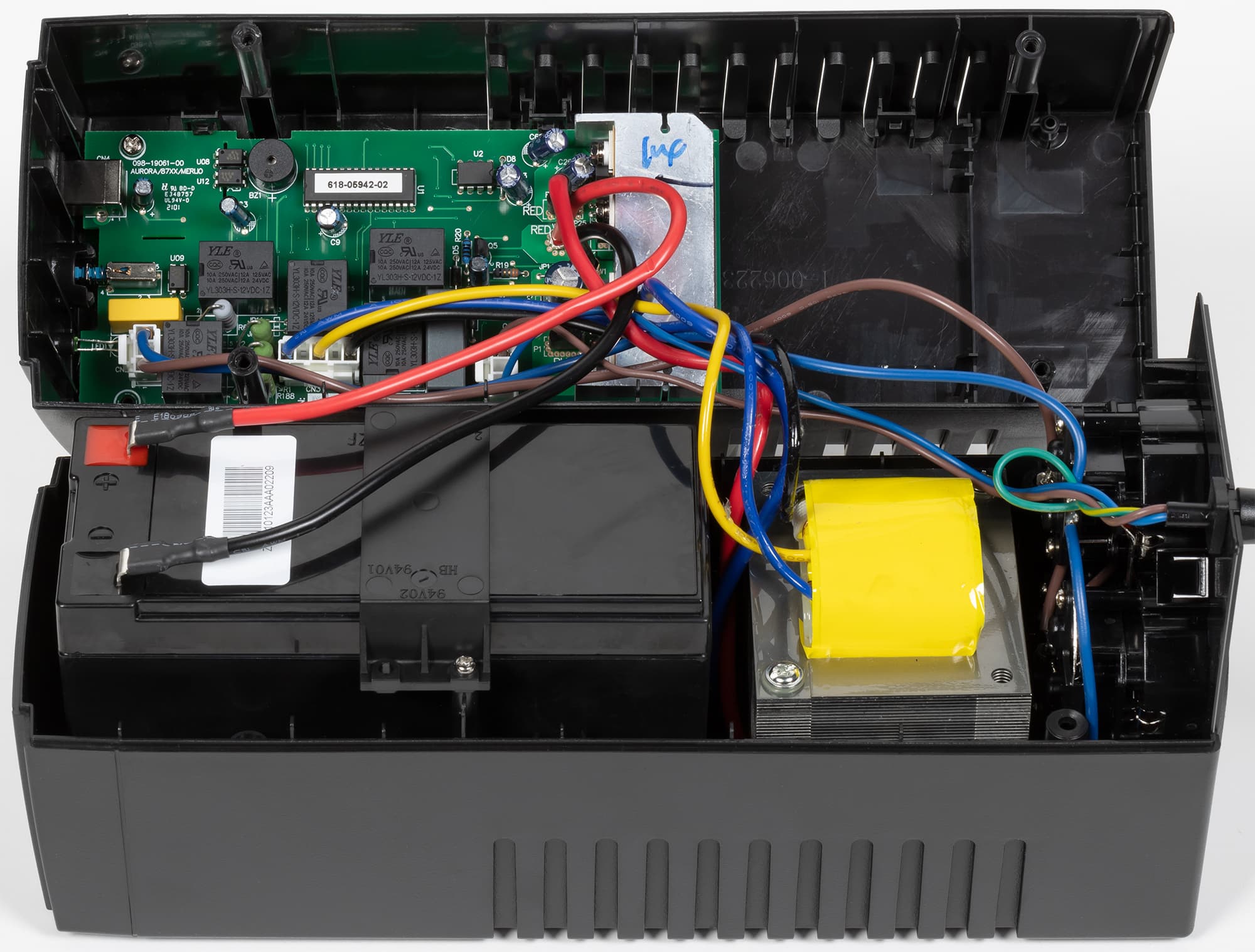 Чтобы вскрыть корпус, нужно перевернуть его «вверх ногами» и удалить четыре больших самореза в колодцах на днище. Затем надо вернуть ИБП в нормальное положение и снять верхнюю П-образную крышку, на которой изнутри закреплена плата с электронными компонентами.