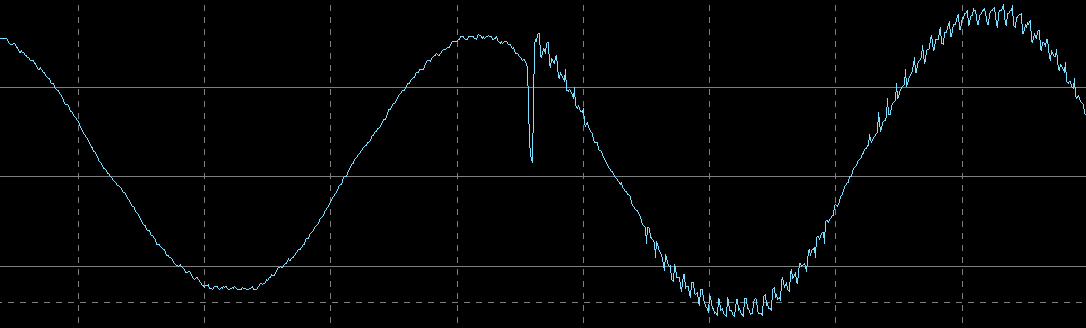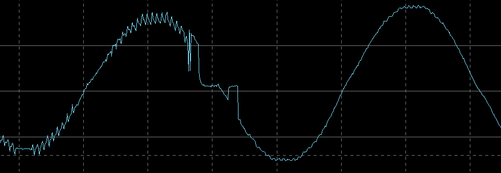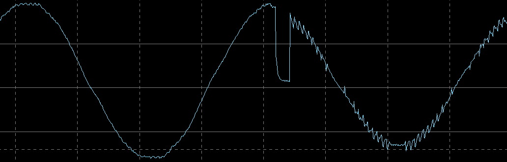 Вот ее внешний вид на нагрузках 100 Вт и 400 В·А (PF = 0,7), цена деления по горизонтали здесь и далее 5 мс; сначала модель Back Basic 1050: