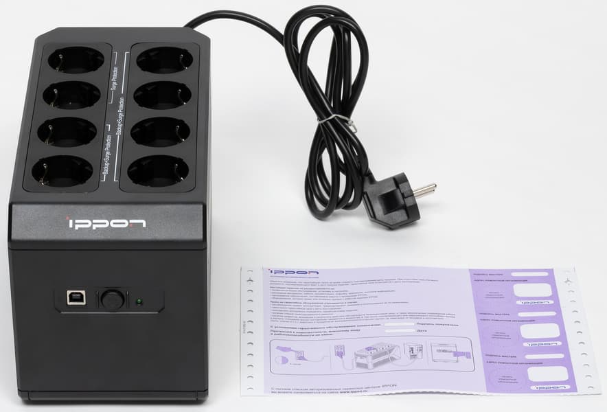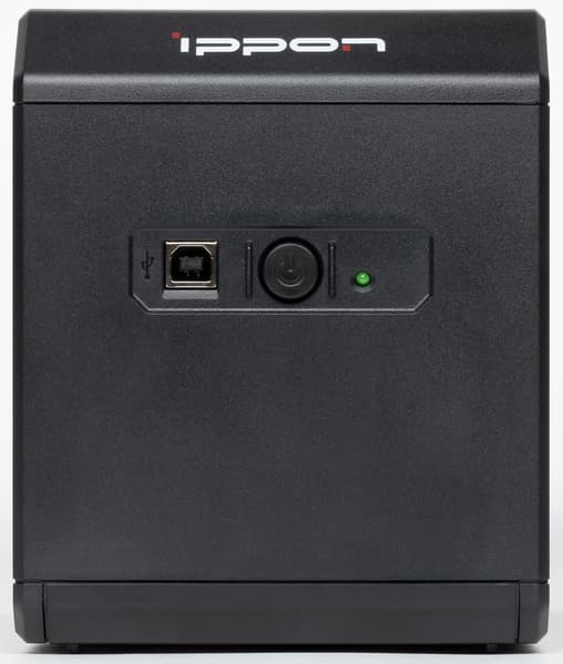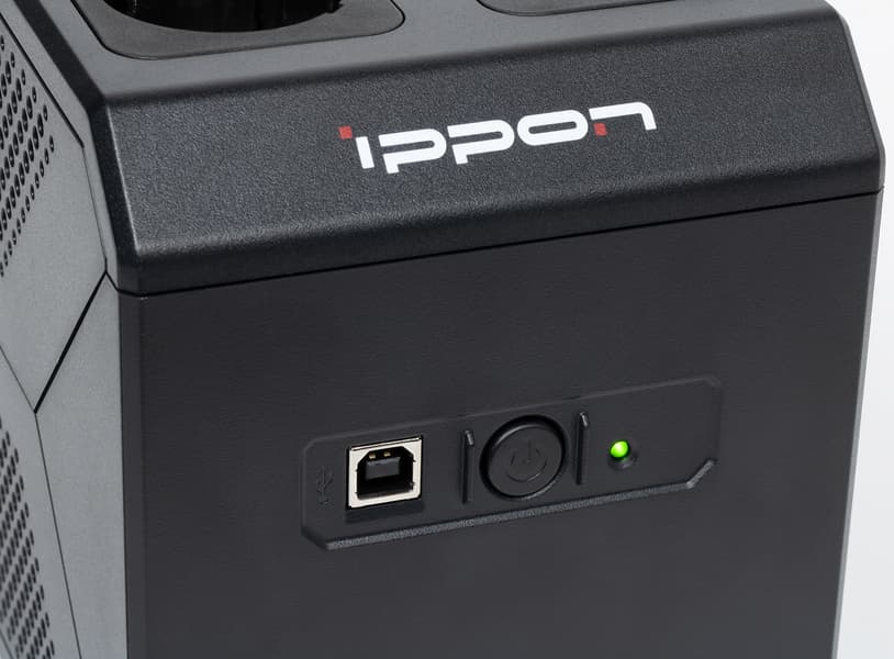 Выходные розетки расположены не сзади, как у большинства аналогов (включая и многие модели Ippon), а «на спине», то есть на верхней крышке. Это не уникальное решение, однако встречается относительно редко, хотя позволяет разместить существенно большее количество розеток, да и добираться до них удобнее как при настольной, так и при напольной установке источника.