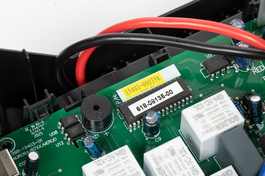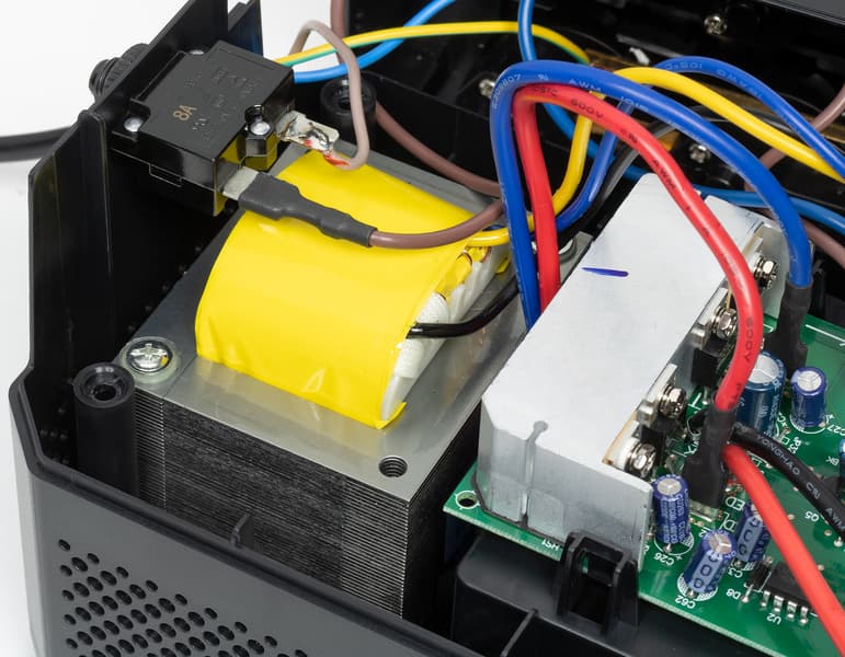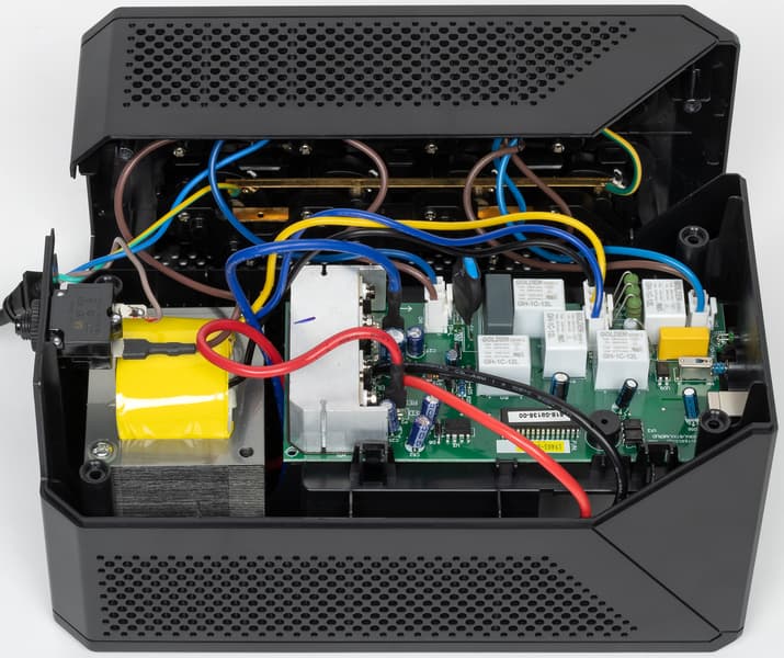 Вклад трансформатора AVR тоже незначительный — по крайней мере, если судить по температуре расположенной непосредственно над ним части верхней крышки. При срабатывании той или иной ступени ситуация практически не меняется: за час работы повышающей ступени на нагрузку 450 Вт корпус в этом месте нагрелся всего на 3-4 градуса.