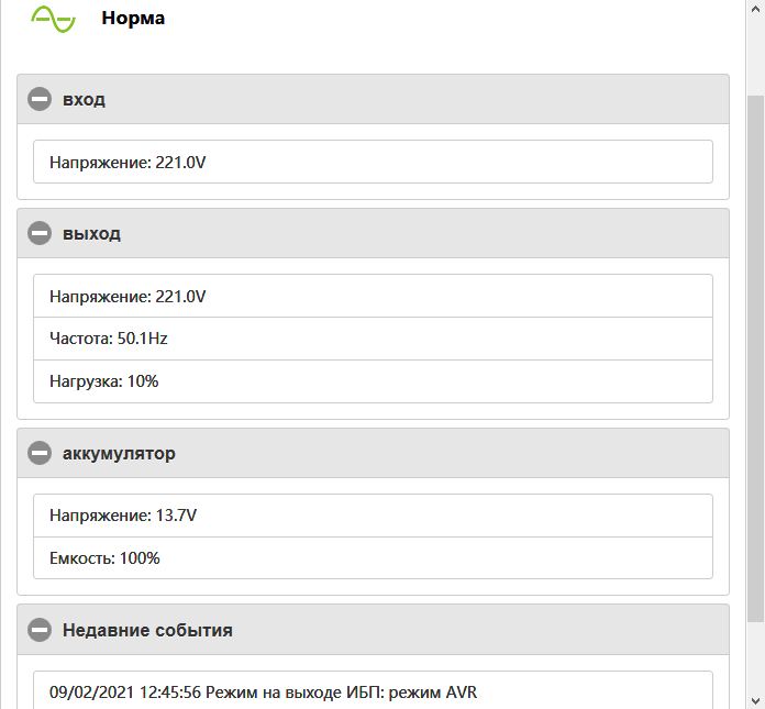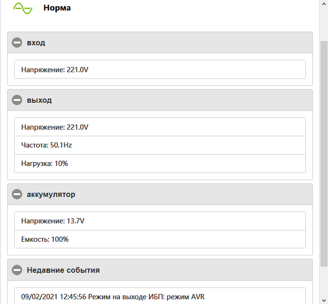 Как видите, из «недр» источника считывается довольно много информации: уровни заряда и нагрузки, напряжения на входе, выходе и батарее, частота и даже температура.