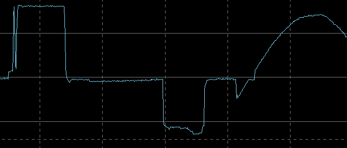 Здесь переходной процесс длится немного дольше, около 4 миллисекунд, и есть небольшой участок, который можно отнести к дребезгу