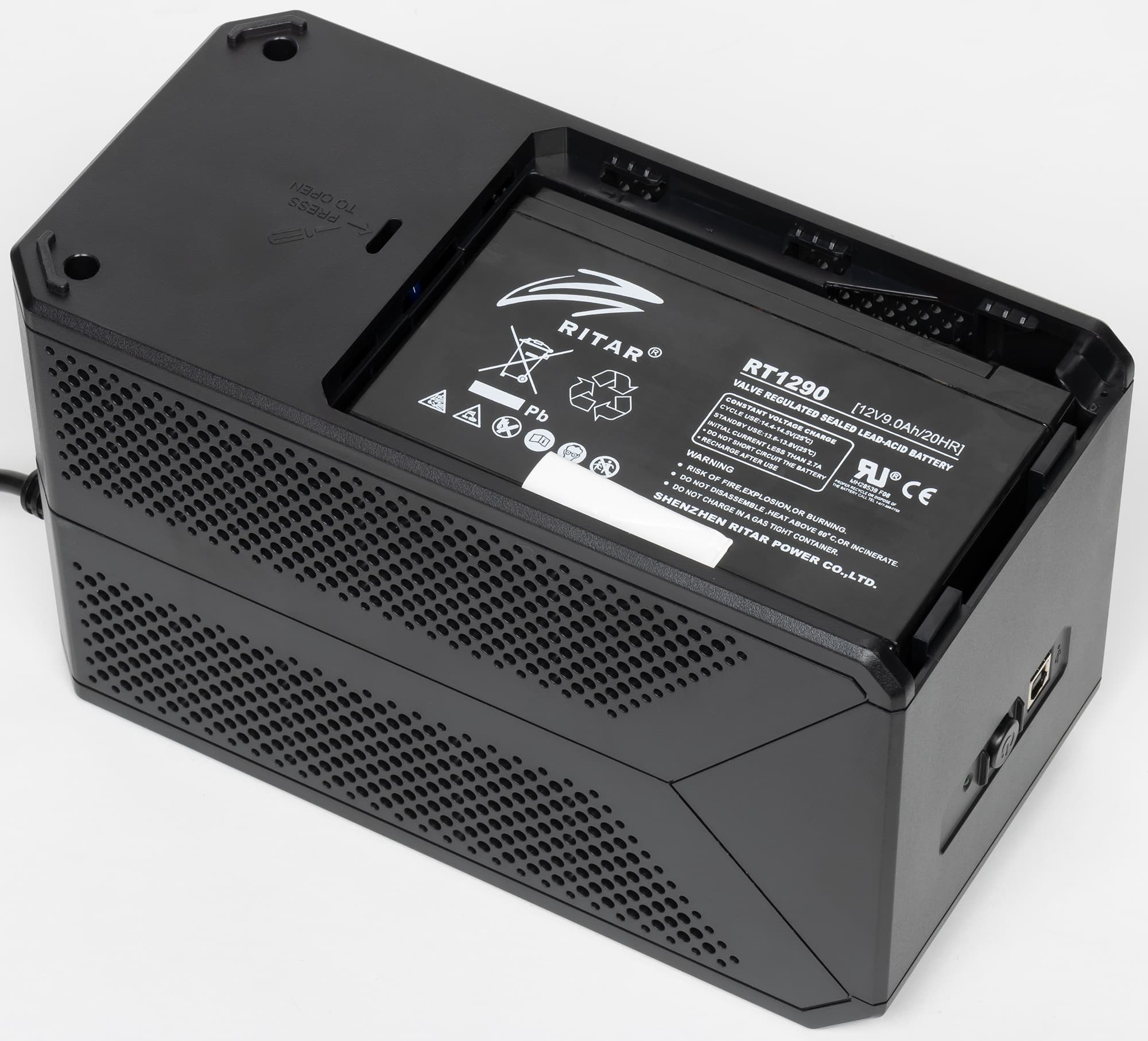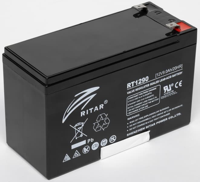 В нашем экземпляре была установлена свинцово-кислотная аккумуляторная батарея Ritar RT1290 с заявленными напряжением 12 В и емкостью 9 А·ч.