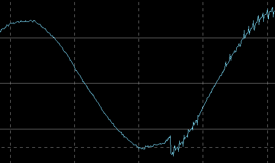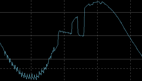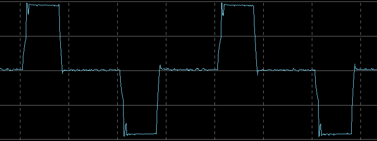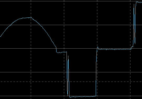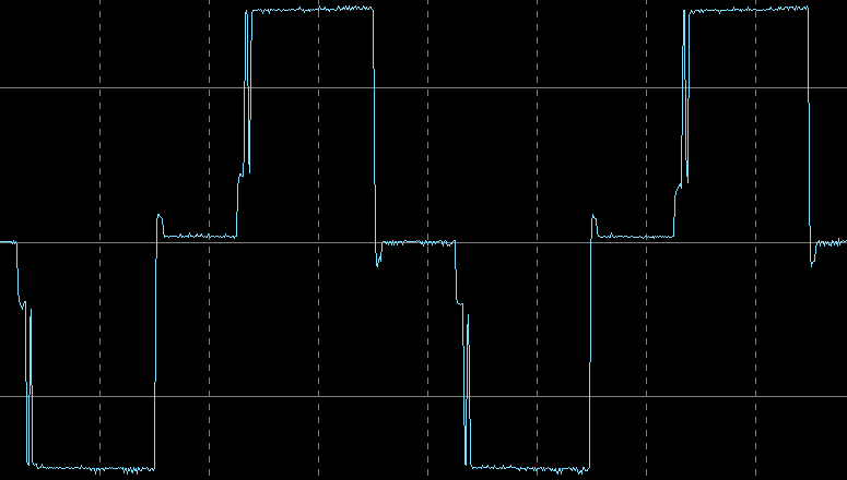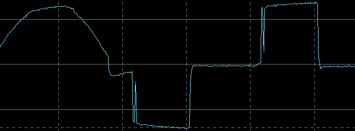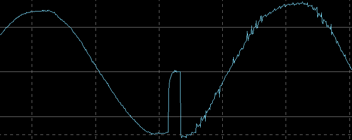 Вот ее внешний вид на холостом ходу и на нагрузке 400 В·А (PF = 0,7), цена деления по горизонтали здесь и далее 5 мс: