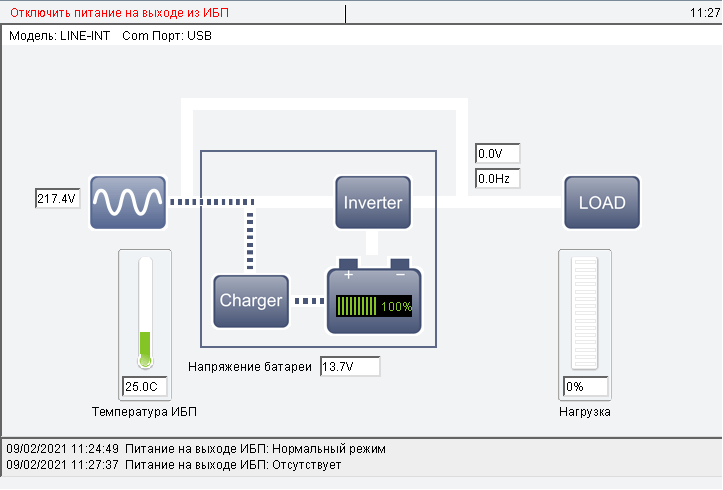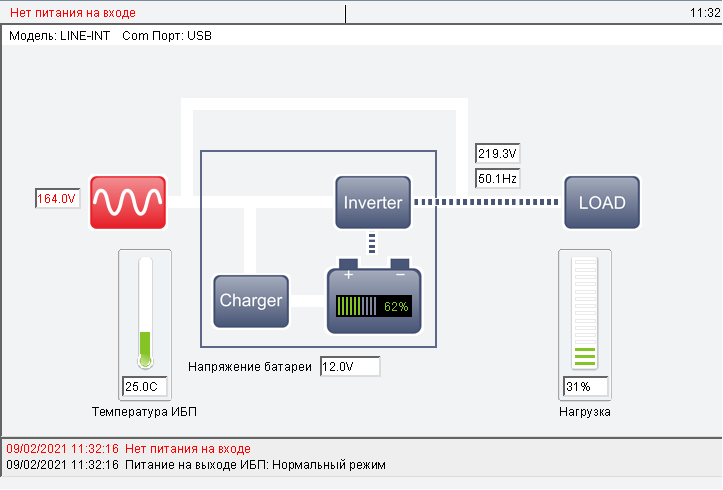 На схеме не учитывается срабатывание системы AVR, оно отображается лишь в виде текстового сообщения в нижней части окна. Переход на батарею приводит и к соответствующей смене «потоков энергии» на картинке, и даже если выключить ИБП кнопкой, оставив его подключенным к розетке, изображение тоже поменяется.