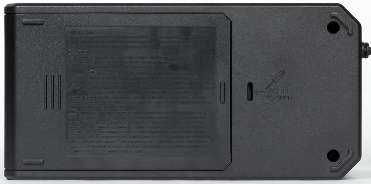 Чтобы вскрыть корпус, нужно перевернуть его «вверх ногами», снять крышку батарейного отсека и извлечь АКБ, после чего удалить четыре больших самореза в колодцах на днище. Затем надо вернуть ИБП в нормальное положение и снять верхнюю крышку вместе с розетками.