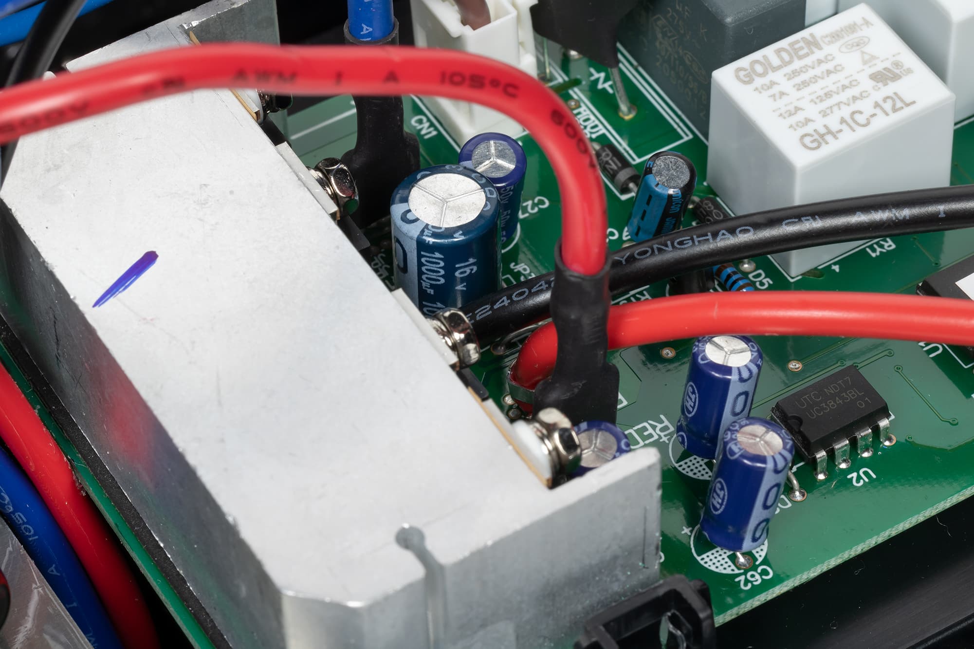 Коммутация осуществляется пятью реле Golden GH-1C-12L, защита от импульсных помех содержит варистор и конденсатор.
