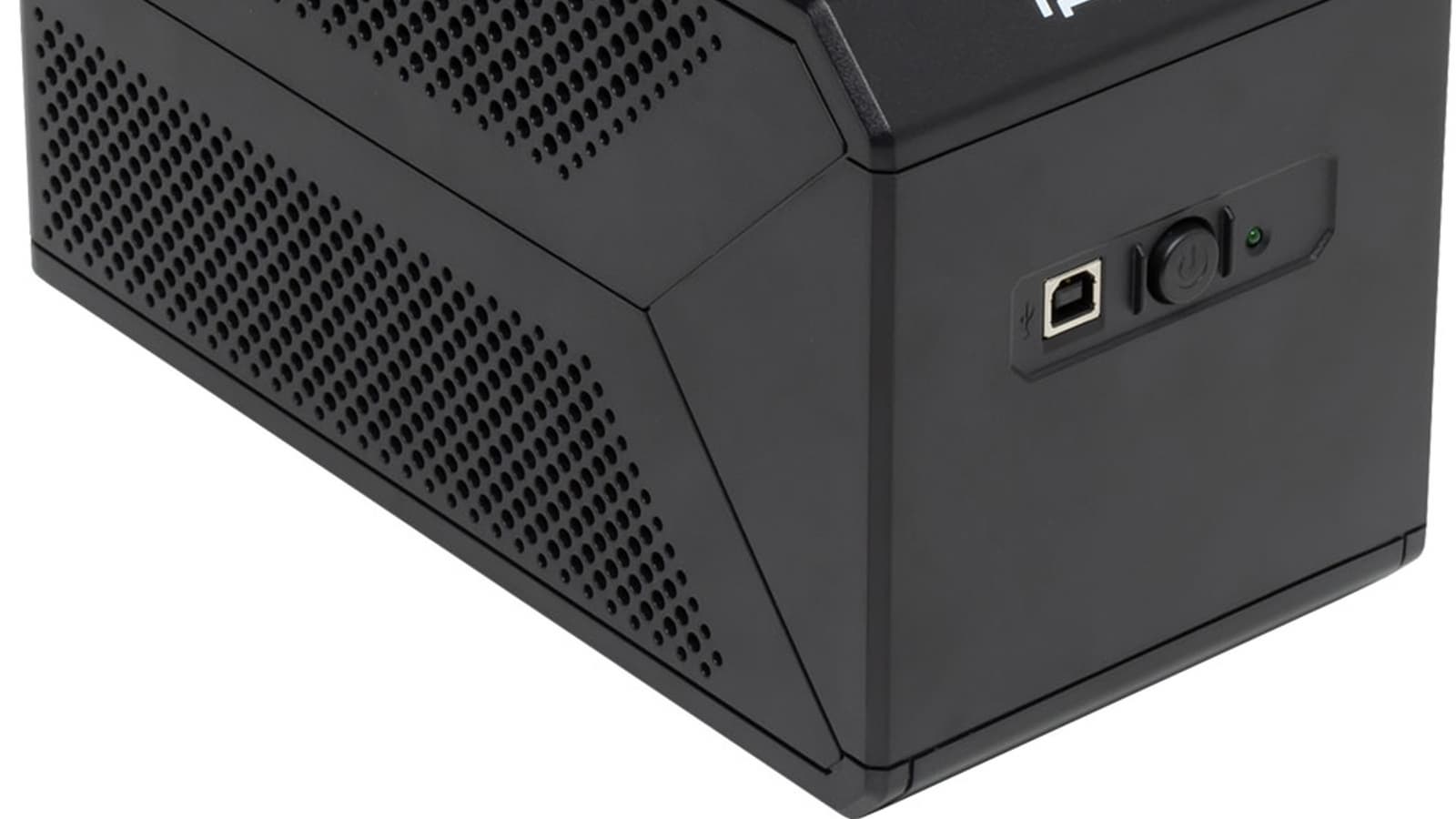 На лицевой панели органов минимальное количество: кнопка Power, единственный индикатор — зеленый светодиод (он горит непрерывно при питании от сети и мигает во время работы от батарей), а также разъем USB-B. По нашему мнению, этот порт все же лучше размещать на задней стенке: торчащий вперед USB-кабель легче случайно задеть и выдернуть или даже повредить, чем если бы он выходил сзади, а подключать или отключать его приходится редко.