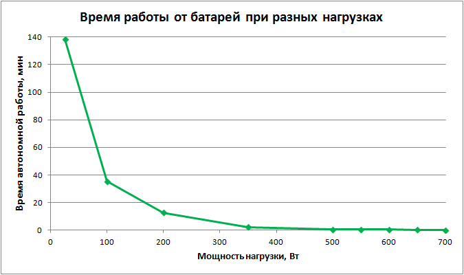 | Нагрузка, Вт | Время работы от батарей, ч:мм:сс |