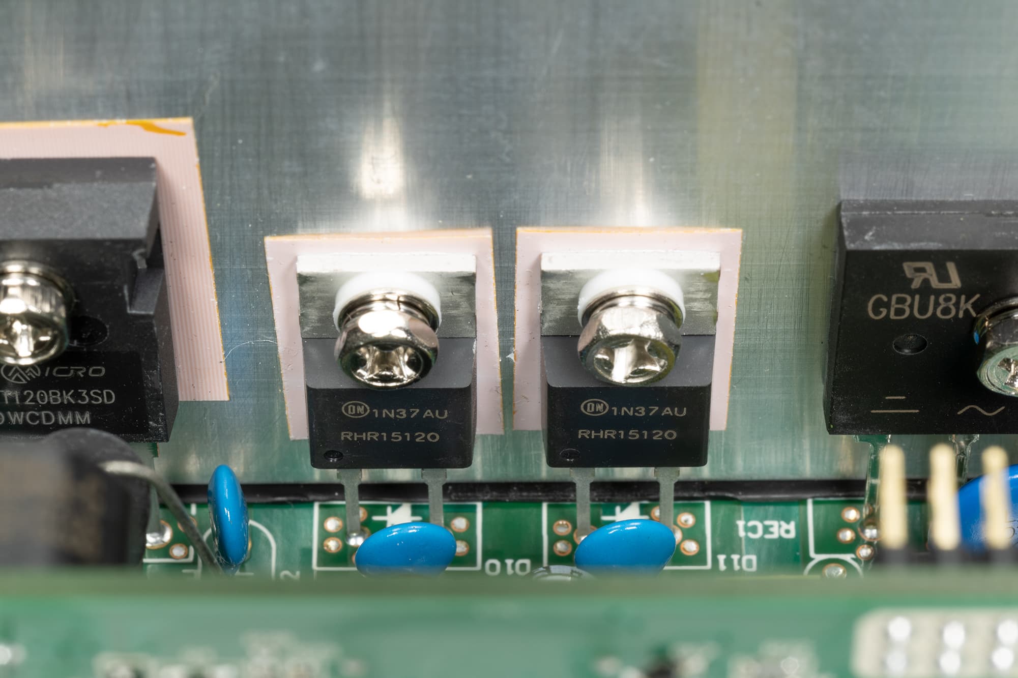 По характеру шум ровный, исключая лишь переходы от одной скорости к другой, привлекающих внимание или раздражающих призвуков нет. Тем не менее, работу рядом с источником комфортной не назовешь: на низкой скорости вентилятор работает всегда, на высокой — при наличии существенных нагрузок в линейном режиме, а при работе от батареи даже без нагрузки. Остается только гадать, откуда в описании появилась фраза про низкий уровень шума, пусть даже и при работе от сети: если сравнить с замерами для других подобных источников, значения получаются вполне сопоставимыми.