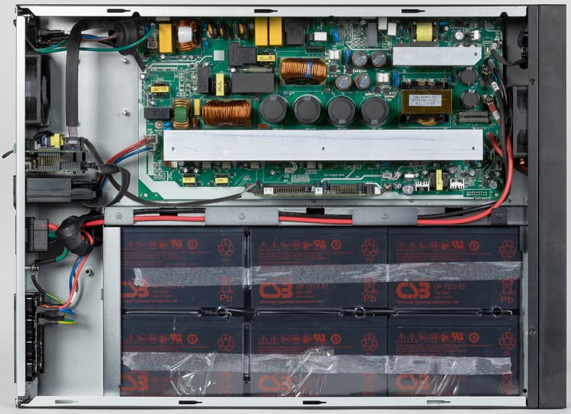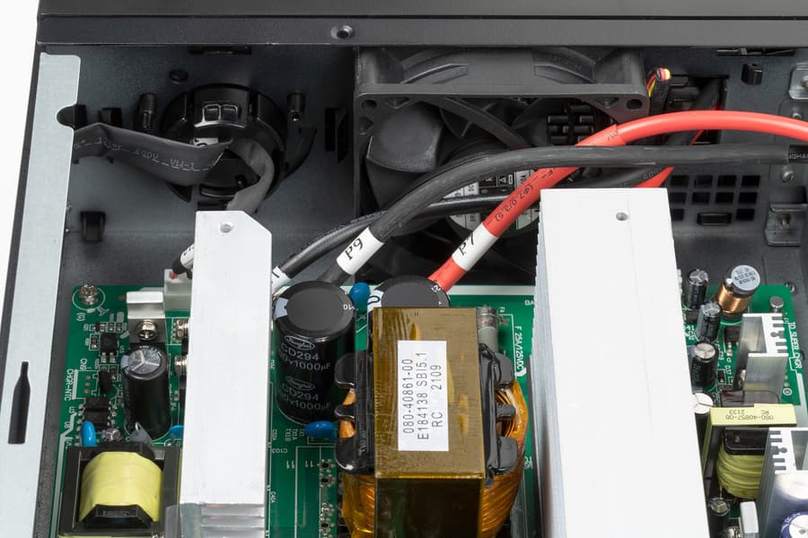 Не беремся утверждать, будут ли эти элементы нагреваться еще больше с закрытой крышкой: без нее эффективность постоянно работающих вентиляторов все же меньше. А их роль очень важна: внешние поверхности ИБП во время наших тестов в самых разных режимах и с самыми разными нагрузками нагревались всего на несколько градусов — не более чем на 5-6 °C в самом горячем месте, которое находилось над платой и вне зоны размещения батарей, подогрев которых оказывался минимальным.