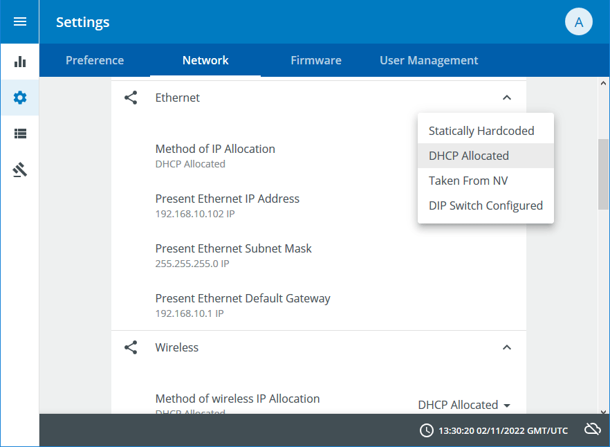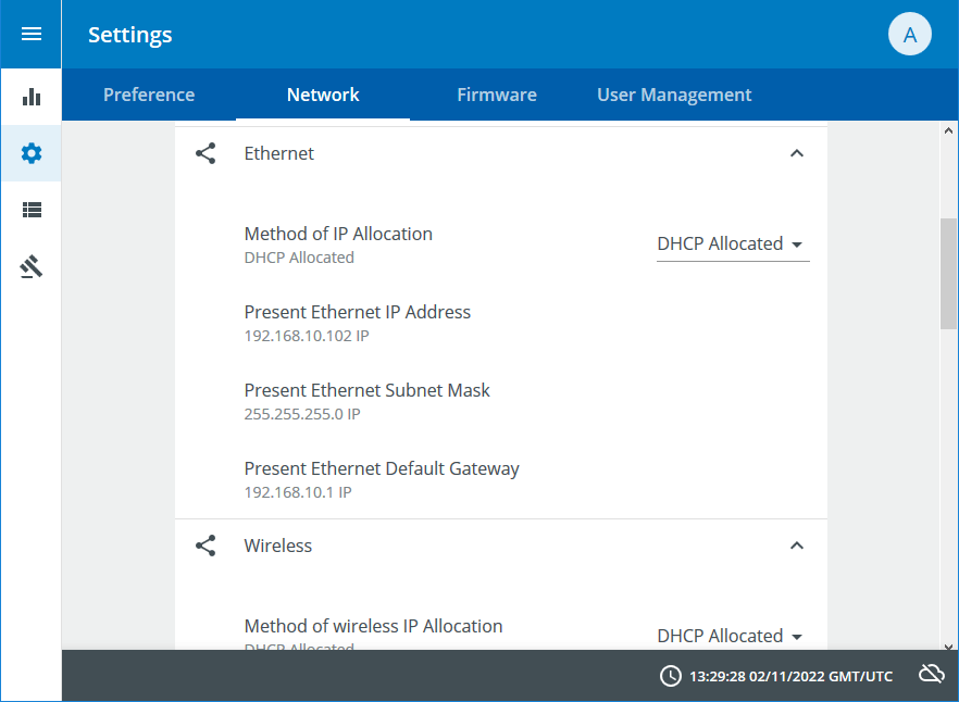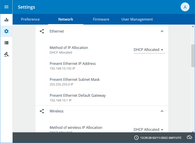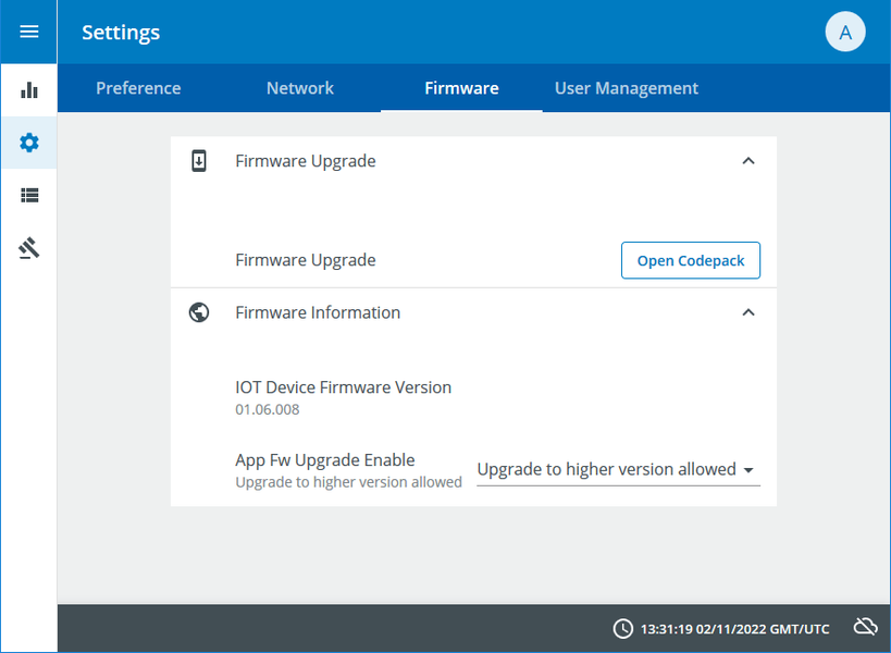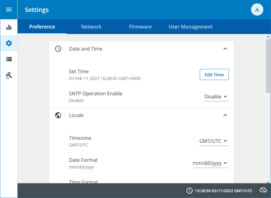 В настройках (клик по символу шестеренки слева) задаются время, включая использование SNTP и формат отображения, параметры веб-сессии (например, таймаут неактивности). Можно обновить прошивку-firmware, но не самого источника, а сетевой карты.