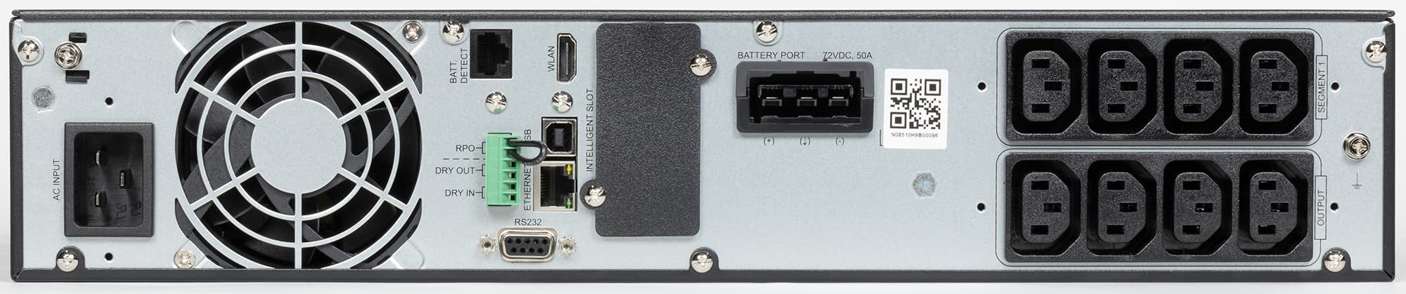 - встроенный порт Ethernet и опциональный порт WLAN обеспечивают удаленное отслеживание состояния ИБП, в том числе через мобильное приложение,