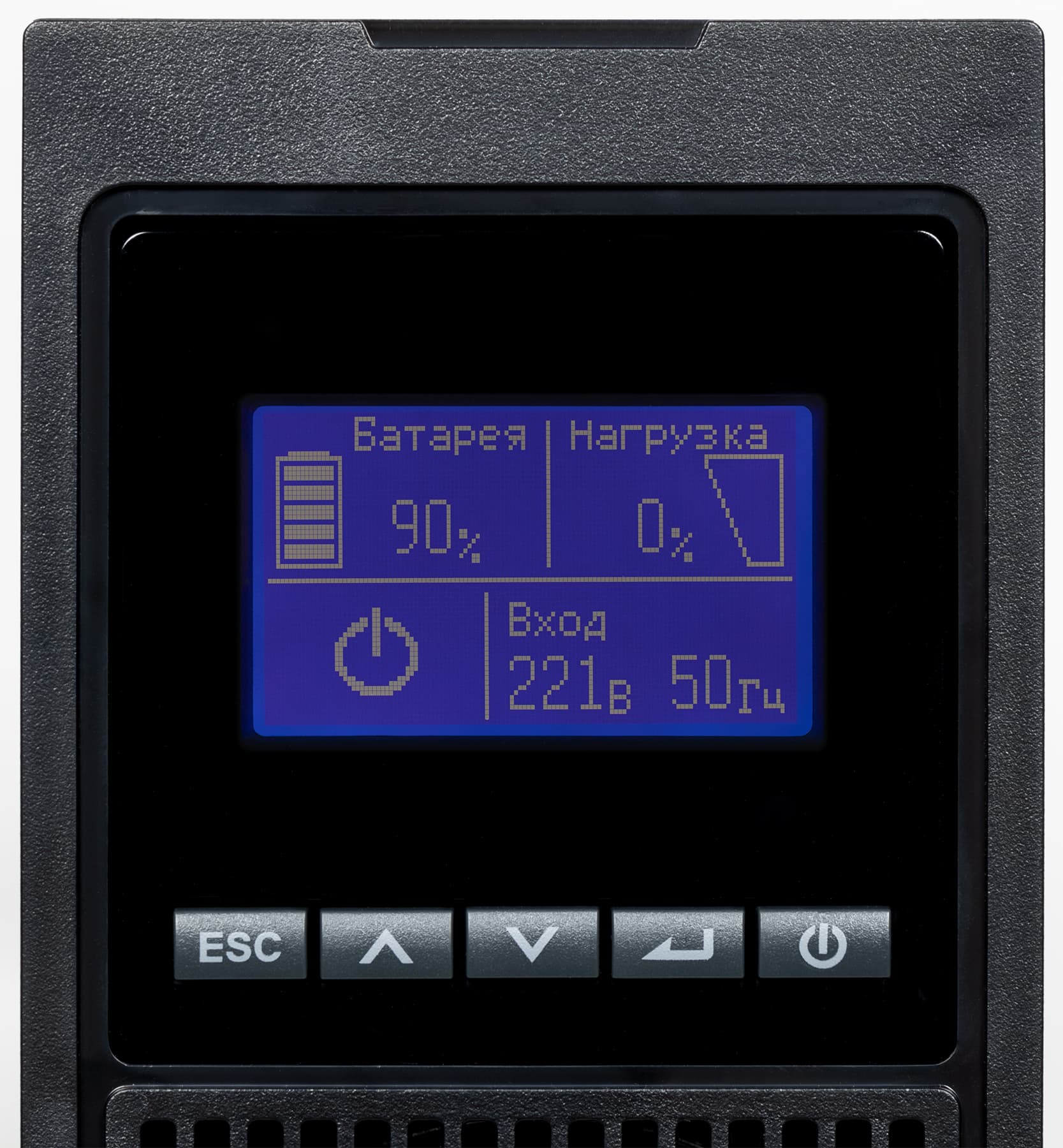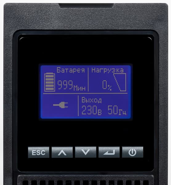 Над дисплеем имеются четыре светодиодных индикатора, показывающих режимы работы — онлайн (зеленый), от батареи и через байпас (оранжевые), а также наличие неисправности (красный).