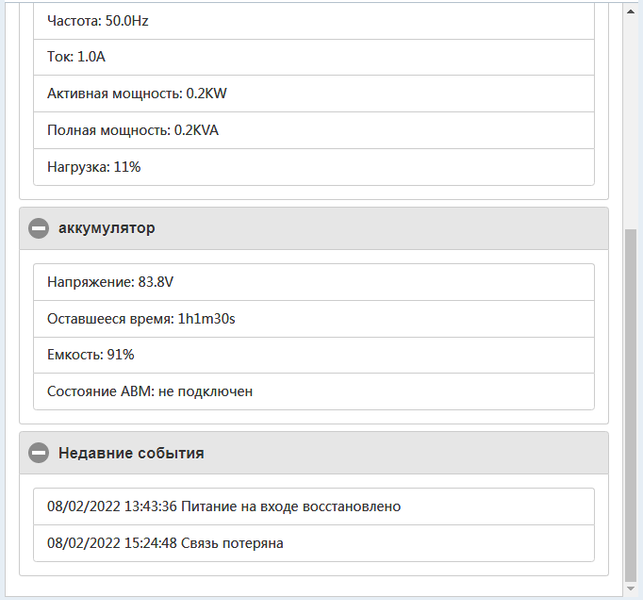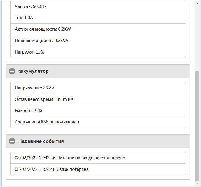 Как и у других побывавших у нас ИБП Ippon, ничего интересного там нет: немного сведений о состояниях на входе (здесь также нет частоты, а для напряжения отображается ноль), на выходе и батарее, а также пара последних событий.