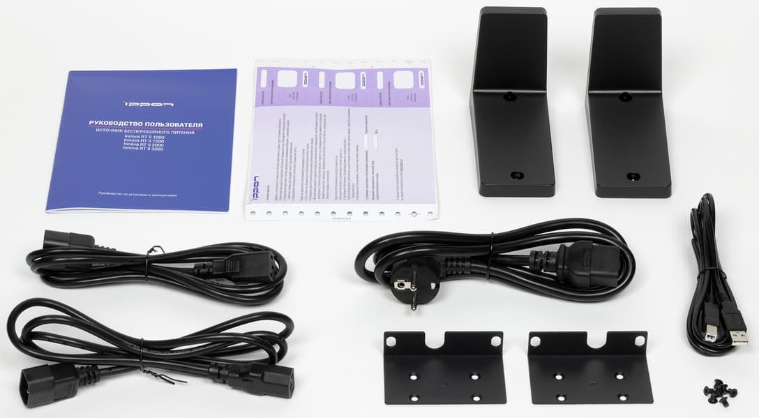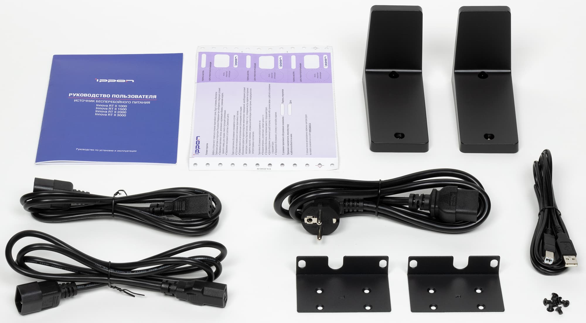 В комплект имеются кабели: один для подключения к сети переменного тока и два С13/С14 для нагрузок, а также интерфейсный USB, две ножки для вертикальной установки, инструкция на русском языке и гарантийный талон. Есть также две планки для монтажа в 19-дюймовую стойку с помощью направляющих из комплекта, который приобретается дополнительно.