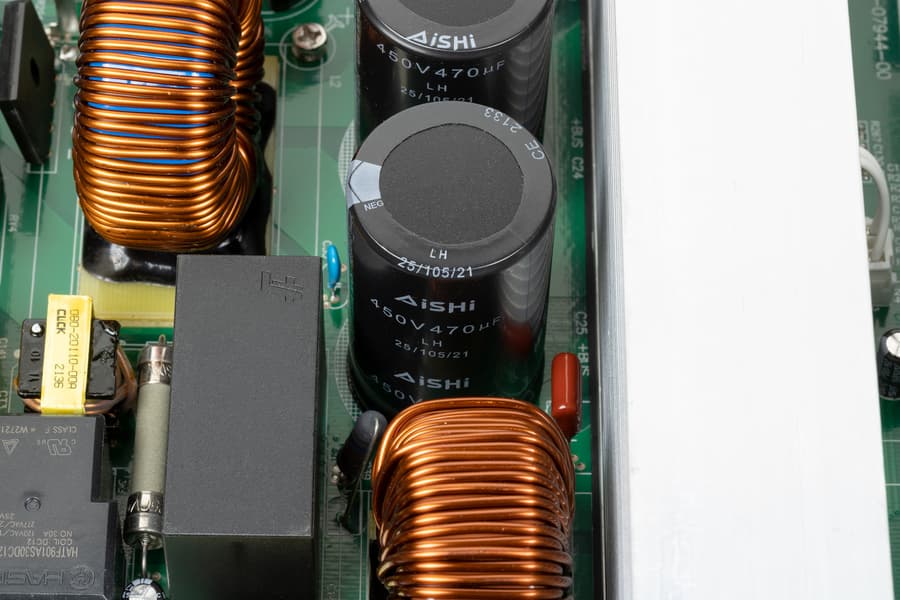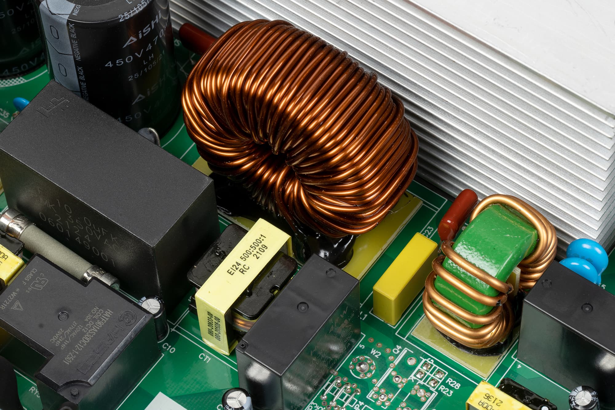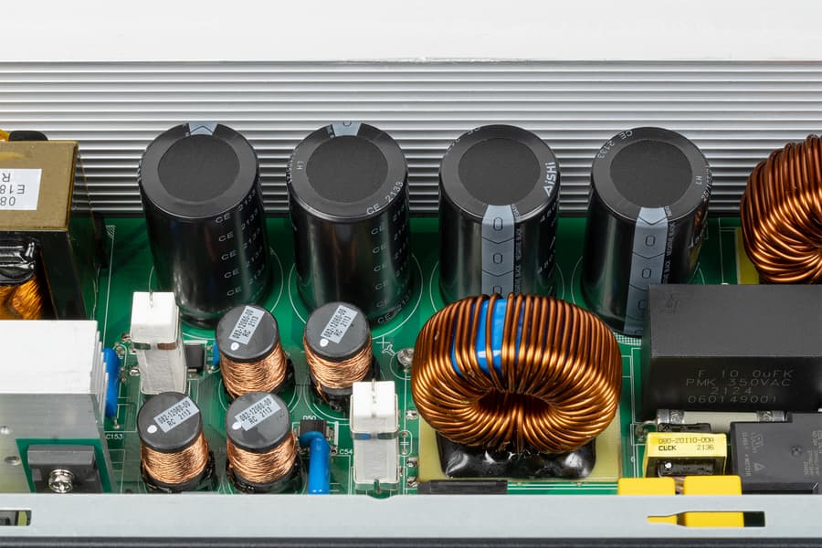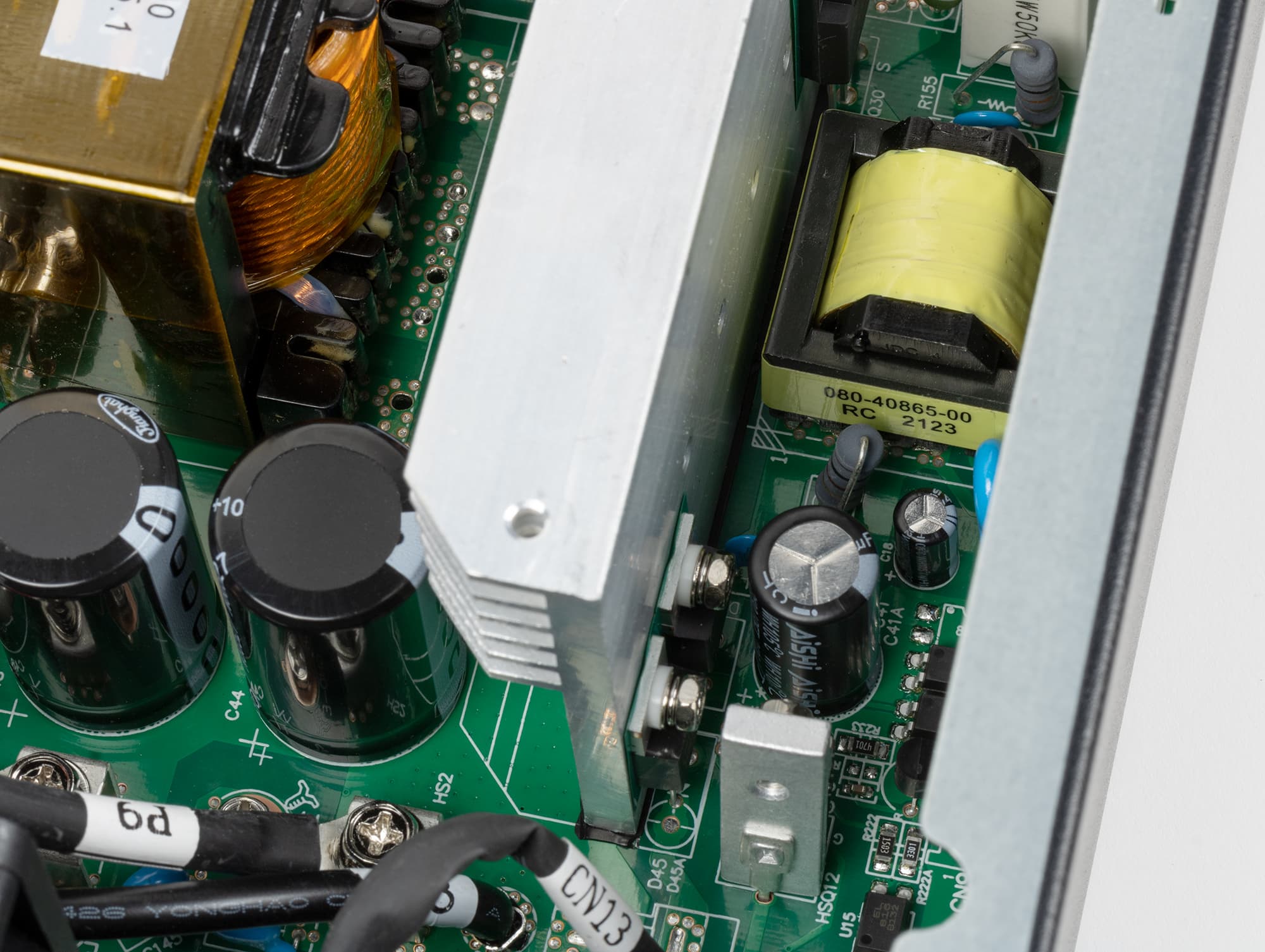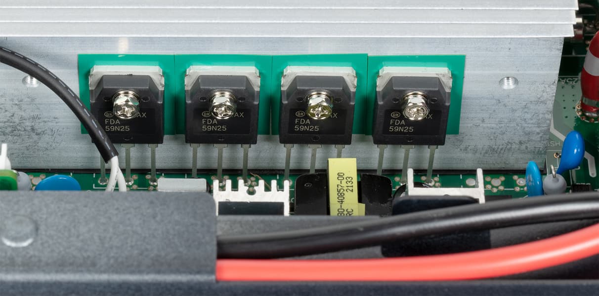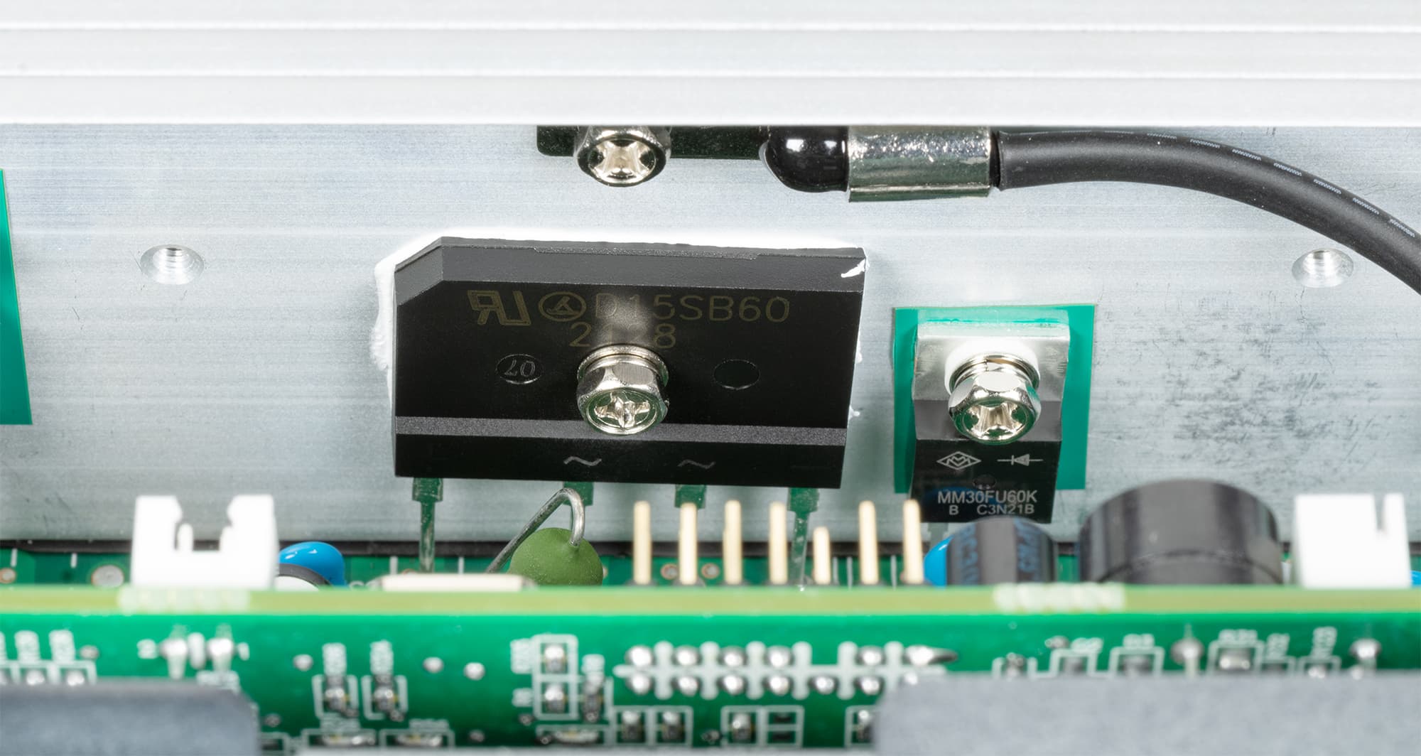 В целом большой радиатор нашего источника нагревался умеренно: на его верхней плоскости мы зафиксировали превышение температуры не более чем на 8-9 градусов относительно температуры в помещении, однако в отдельных точках возле силовых компонентов нагрев был более существенным: на 25-27 градусов. Дроссель L1 нагревался на 39-40 градусов, L2 — на 23-24 градуса.