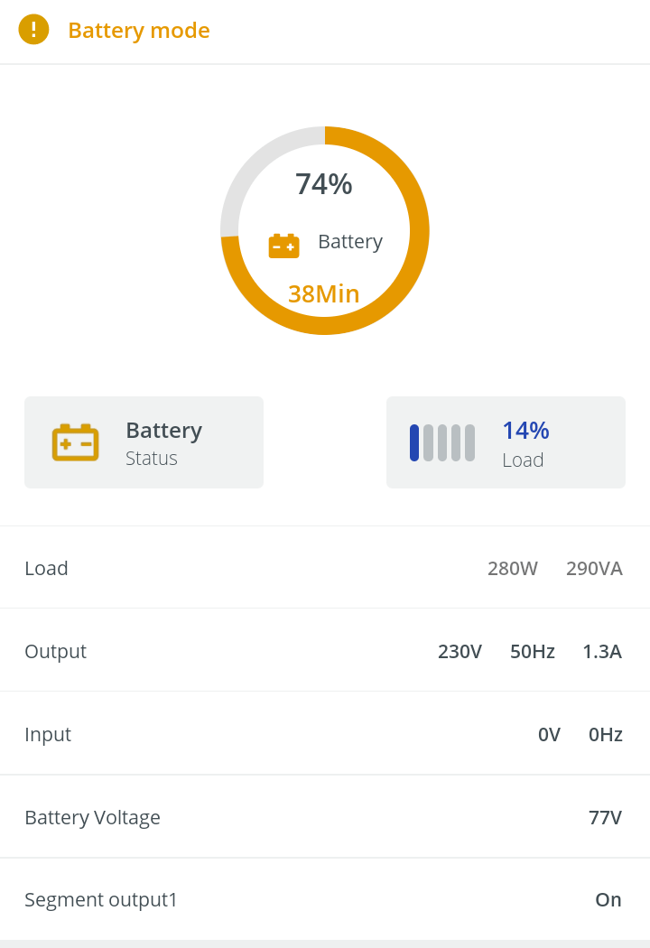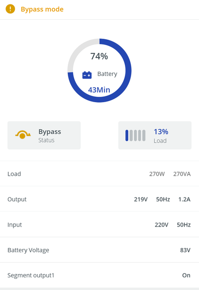 Четыре последних строчки — работа от батареи с превышением номинальной мощности. Пока это превышение по оценке самого ИБП было не более пяти процентов, автономная работа явно велась до исчерпания заряда, а при дальнейшем увеличении нагрузки срабатывал двухминутный лимит, упомянутый в приведенной на официальном сайте спецификации, но только происходило отключение, а не бессмысленный в данной ситуации переход на байпас, как там написано.