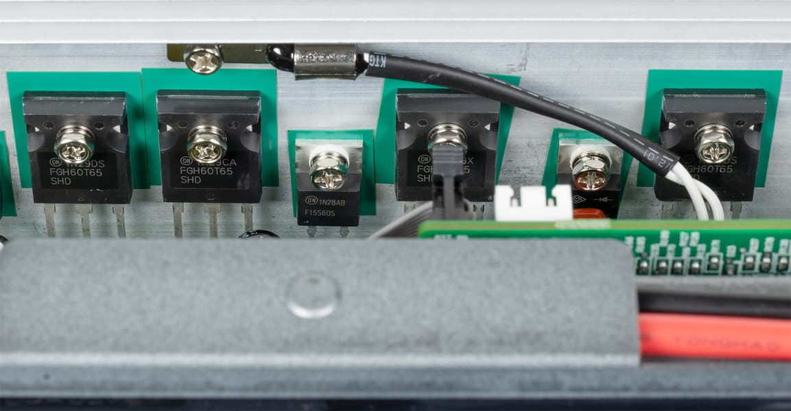 В онлайновых ИБП, к которым относятся модели линейки Ippon Innova RT II, такой «грелки» нет, однако есть постоянно работающие электронные преобразователи на полупроводниковых элементах, которые и являются источником тепла. Как выяснилось, в нашем случае заметный дополнительный подогрев идет от двух крупных дросселей на тороидальных сердечниках. В этом мы убедились, сделав замеры температуры при снятой крышке корпуса и удаленном защитном пластиковом листе.