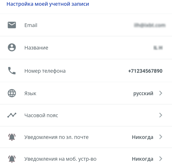 В настройках учетной записи можно выбрать способ уведомлений, а также изменить язык: