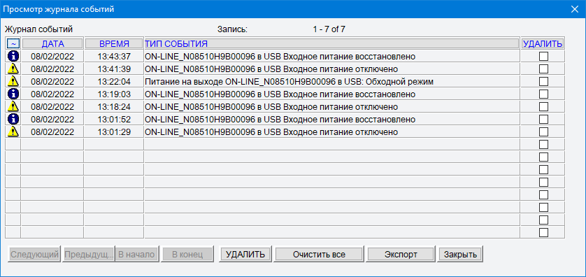 После подключения видим информацию о состоянии источника, включая журнал событий.