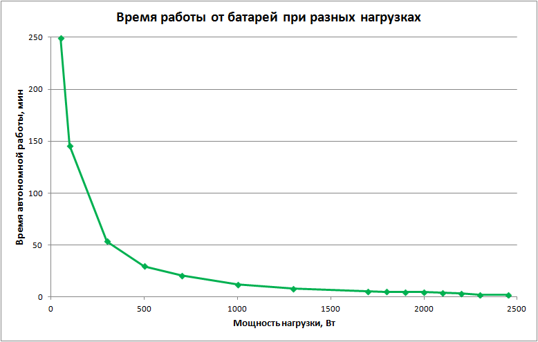 Перейдем к тестированию автономной работы Ippon Innova RT II 2000 с разными нагрузками. Вот результаты в виде графика: