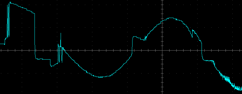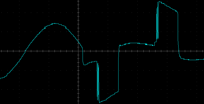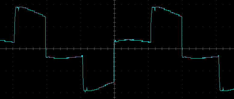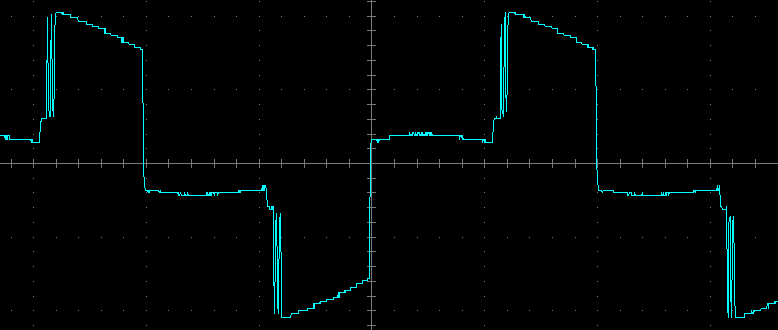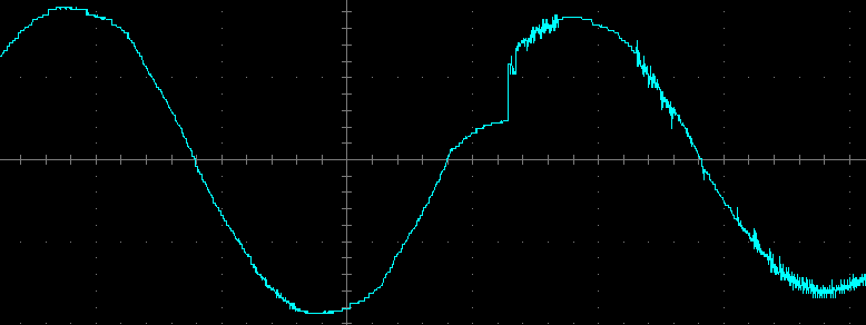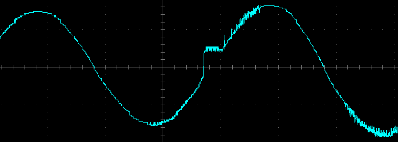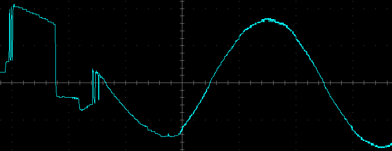 Вот ее внешний вид на нагрузках 100 Вт и 200 В·А (PF = 0,7), цена деления по горизонтали 5 мс: