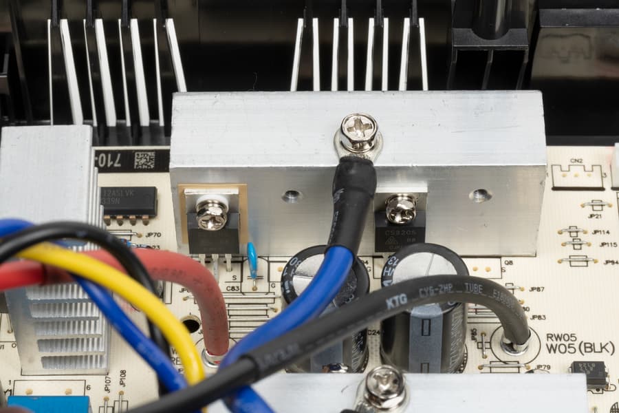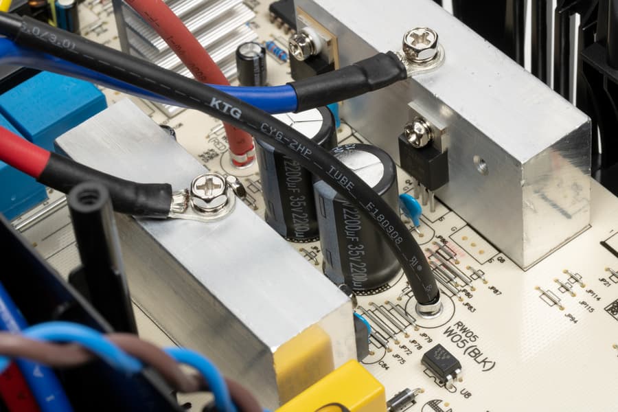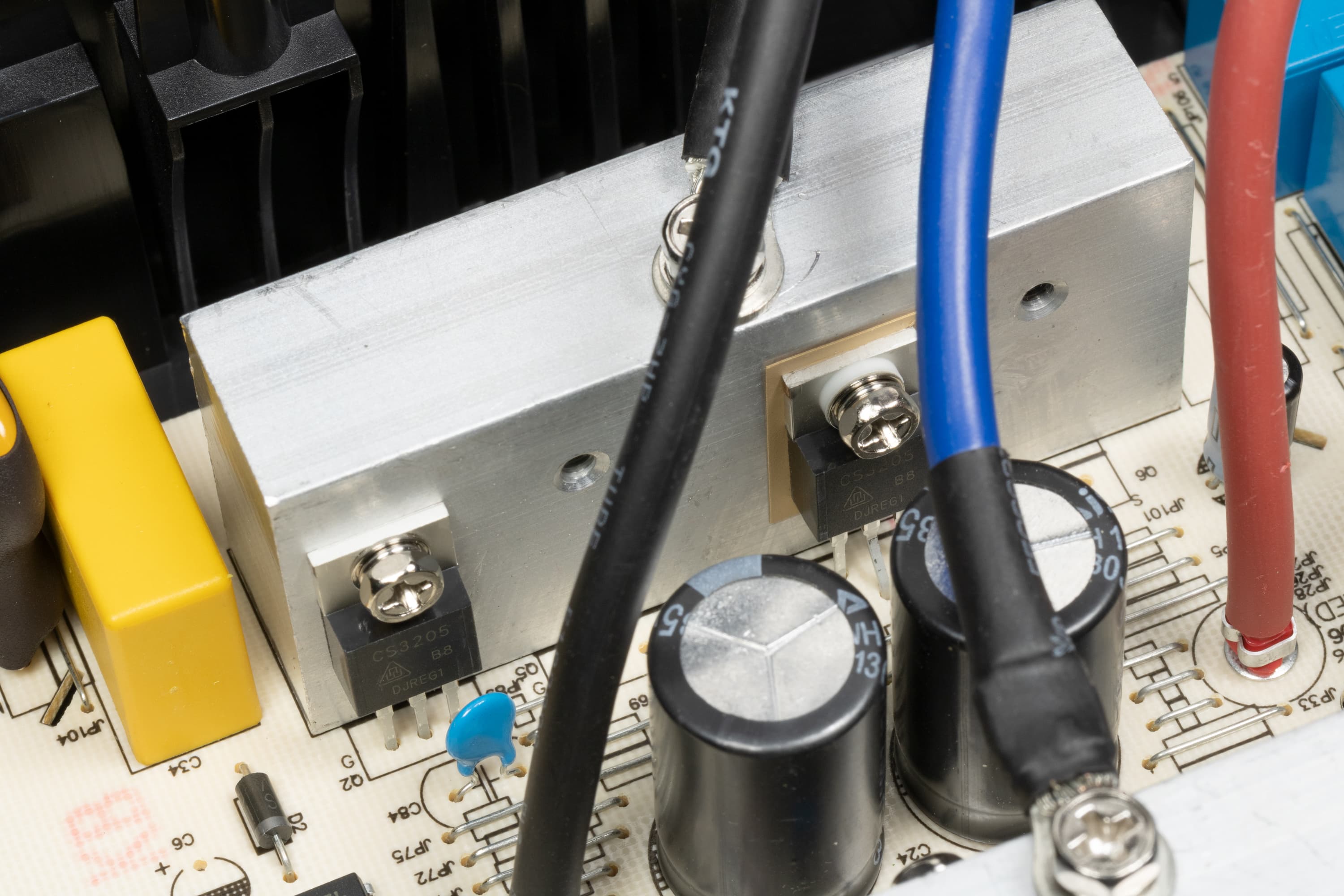 У Ippon Smart Power Pro II Euro 1200 инвертор выполнен на четырех МОП-транзисторах CS3205, попарно закрепленных на двух алюминиевых радиаторах в виде небольших брусков без оребрения, которые расположены над трансформатором, то есть все нагревающиеся элементы сосредоточены в задней половине источника.
