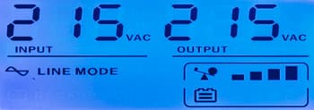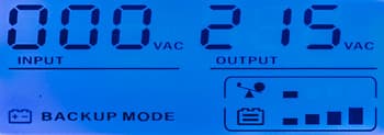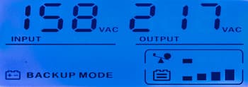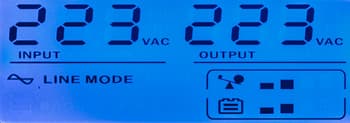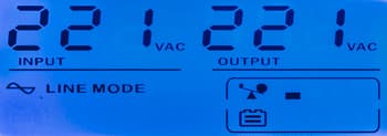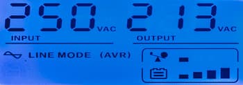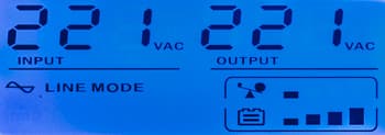 Показания для напряжений читаются нормально, но углы обзора маловаты: так, при взгляде сидящего человека с расстояния вытянутой руки на расположенный на столе ИБП верхние сегменты цифр получаются закрытыми кромкой рамки экрана. Диаграммы при этом видны нормально, а вот надписи и прочие символы мелковаты для обладателей не самого «орлиного» зрения. Но это скорее придирки, у аналогов со схожей ценой (а порой и у более дорогих) экраны примерно такие же, если они вообще есть.
