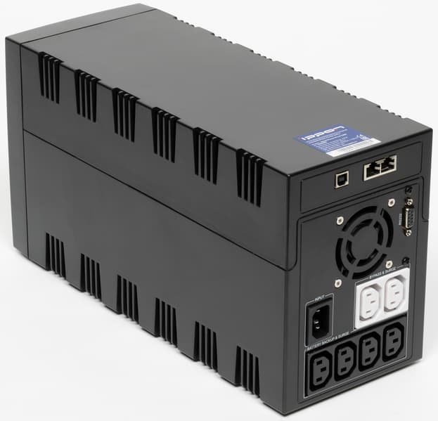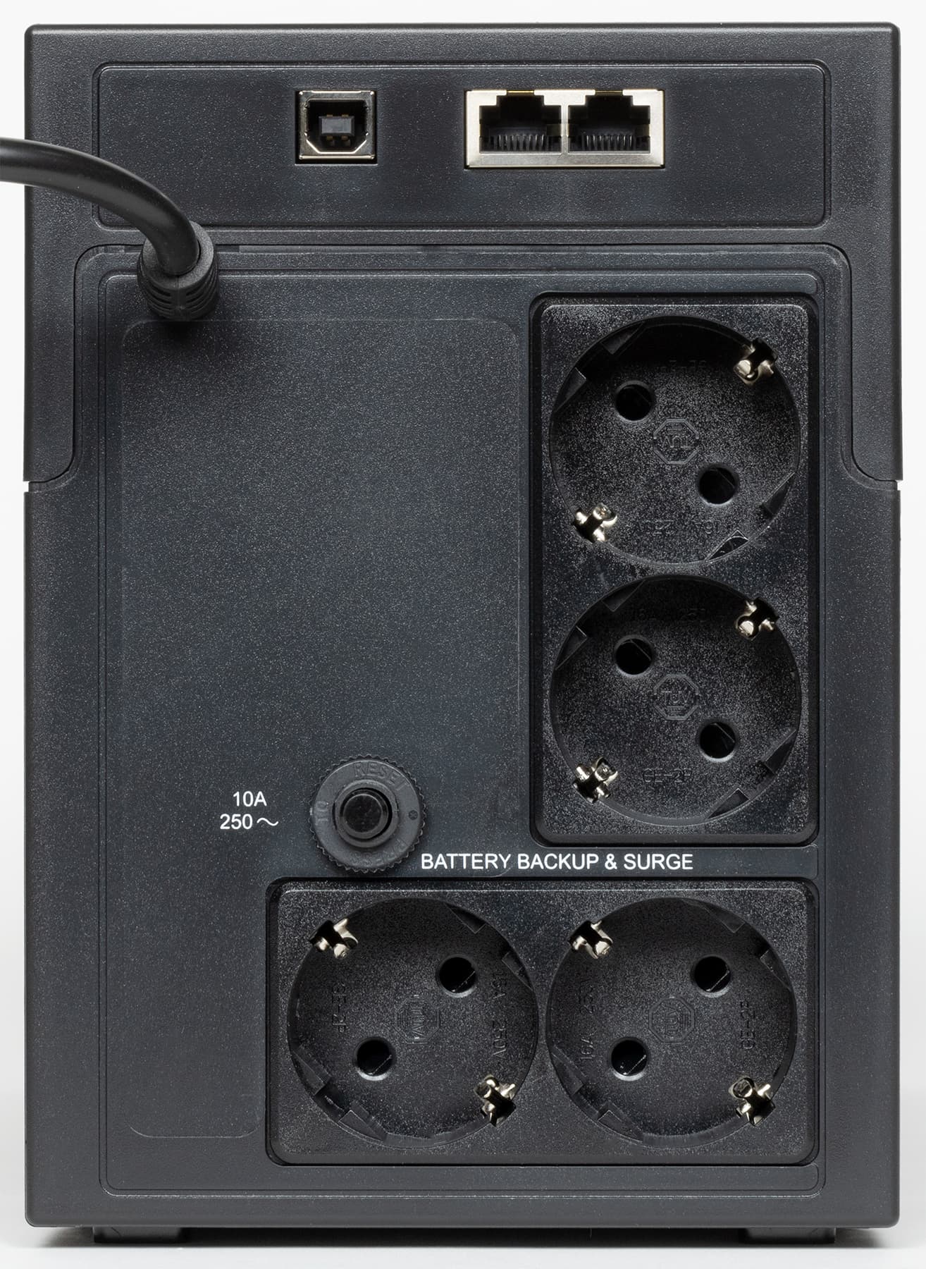 На задней стенке расположены выходные розетки, два разъема RJ-45 для подключения коммуникационных линий с целью их защиты от импульсных помех, порт USB-B для взаимодействия с компьютером и шток автоматического предохранителя. У моделей с выходами С13 еще есть коммуникационный порт RS232 и гнездо С14 для подключения соответствующим кабелем к внешней питающей сети. А у ИБП с «евророзетками» кабель для подключения к сети переменного тока (3×1,0 мм², длина 1,4 м) выходит из отверстия, снабженного защитой от перетирания.