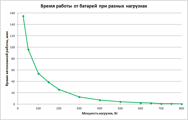 | Нагрузка, Вт | Время работы от батарей, ч:мм:сс |