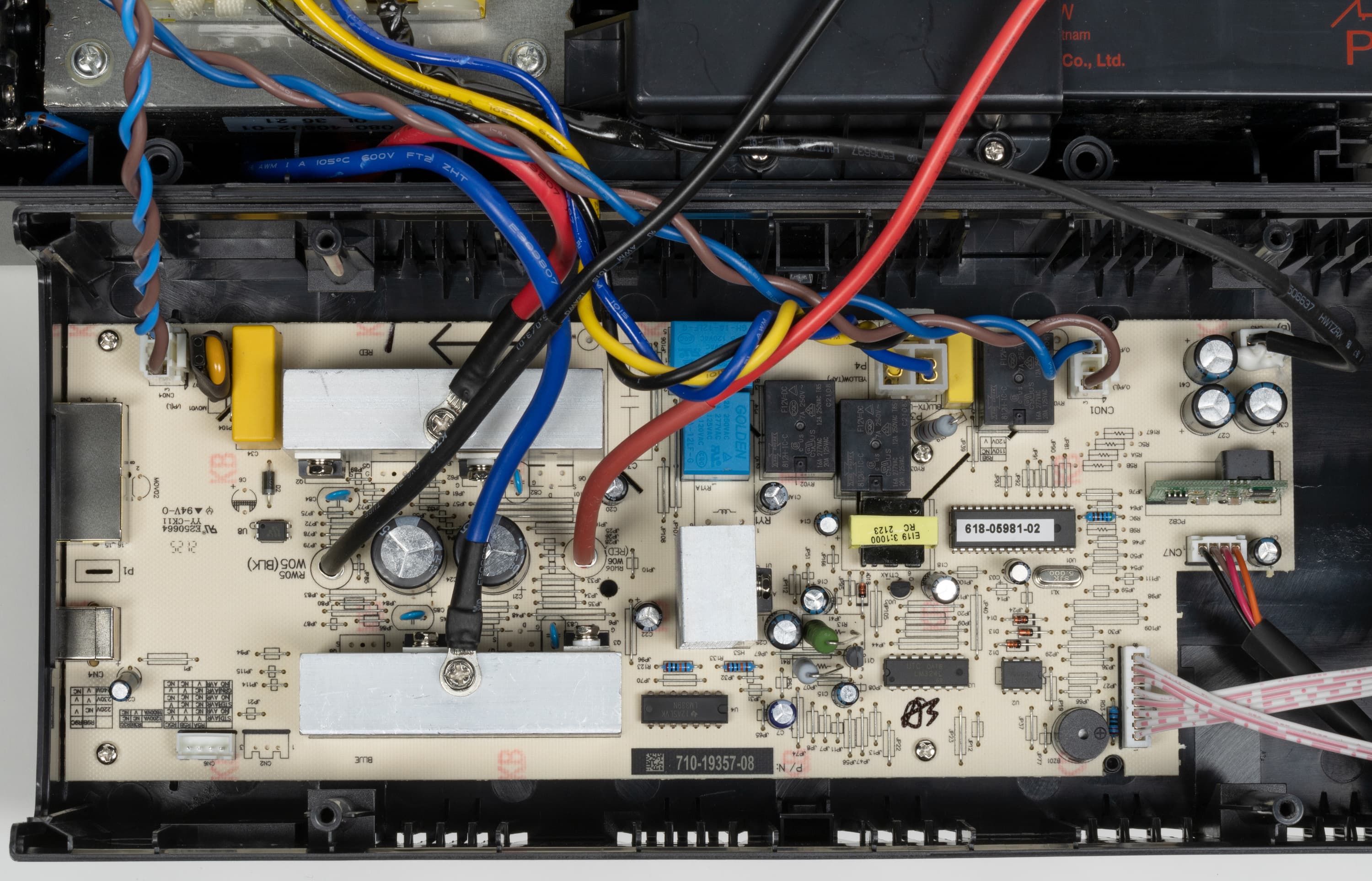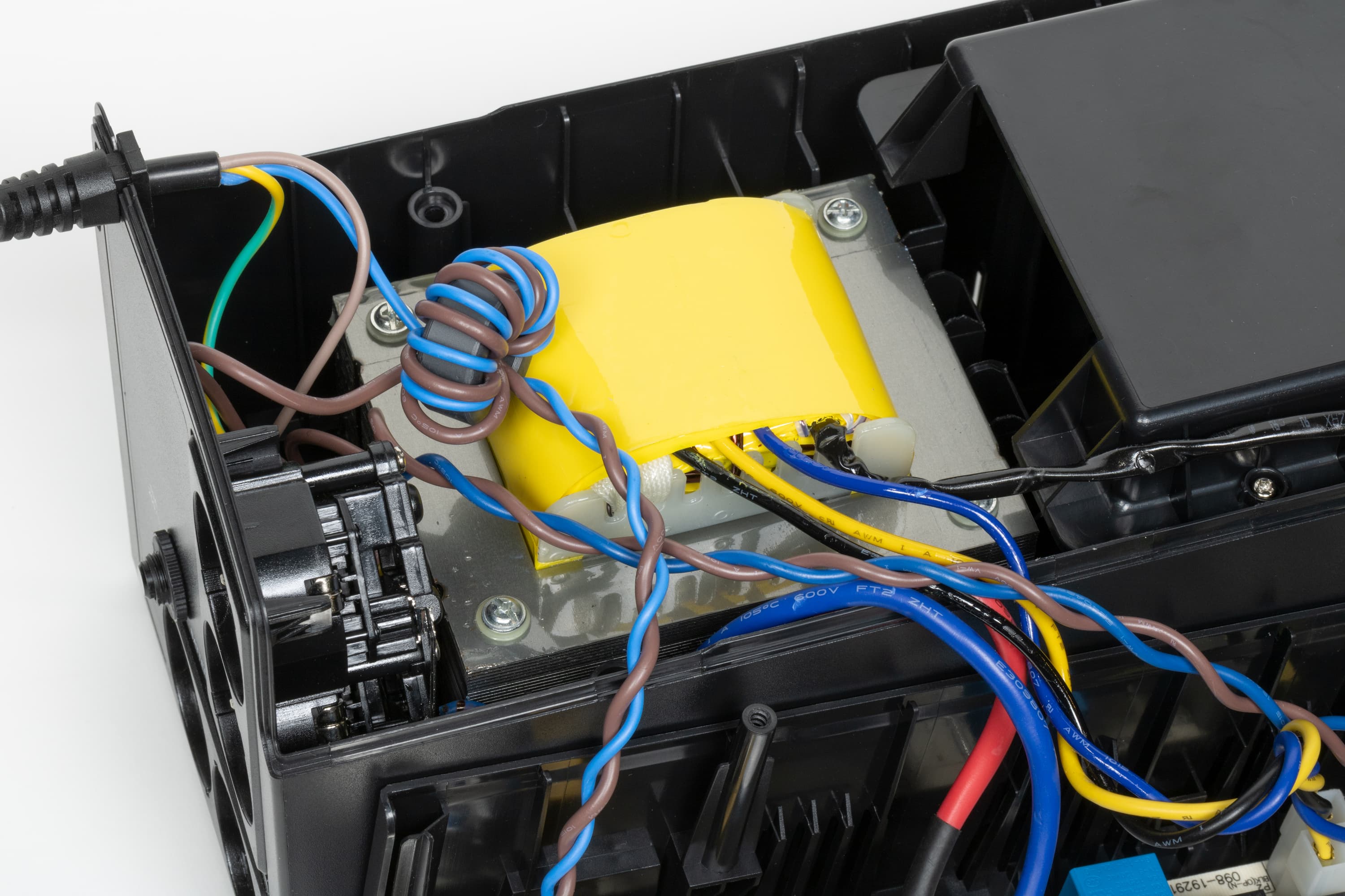 В нижней части остаются: задняя стенка с разъемами, трансформатор системы AVR с сердечником на Ш-образных пластинах, спереди — батарея.
