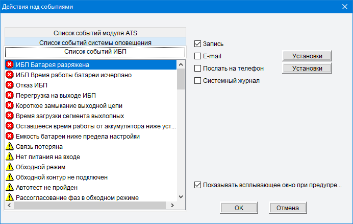 Дальше по порядку: можно переименовать источник («Установка модели ИБП»), но вряд ли это следует называть параметром управления. «Действия над событиями» подразумевают разного рода оповещения и необходимые для них установки:
