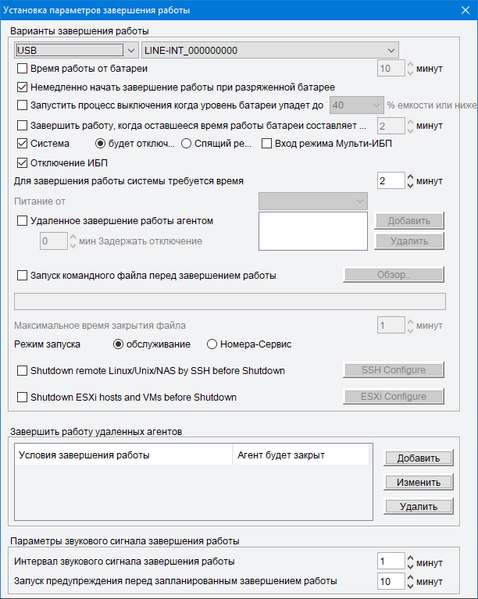 В параметрах управления ИБП единственная строчка — отключение звуковых сигналов при работе от батареи. Они действительно отключаются, но лишь до тех пор, пока работает программа: если выключить компьютер, на котором она запущена, то сигналы возобновятся.
