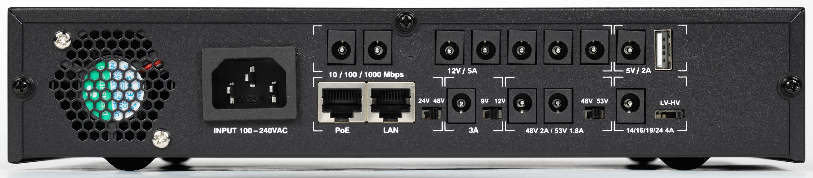 - затем два гнезда того же типоразмера с напряжением 48 В (ток до 2 А) или 53 В (до 1,8 А), также выбираемым с помощью переключателя; подобное нужно для сетевых видеорегистраторов (NVR),