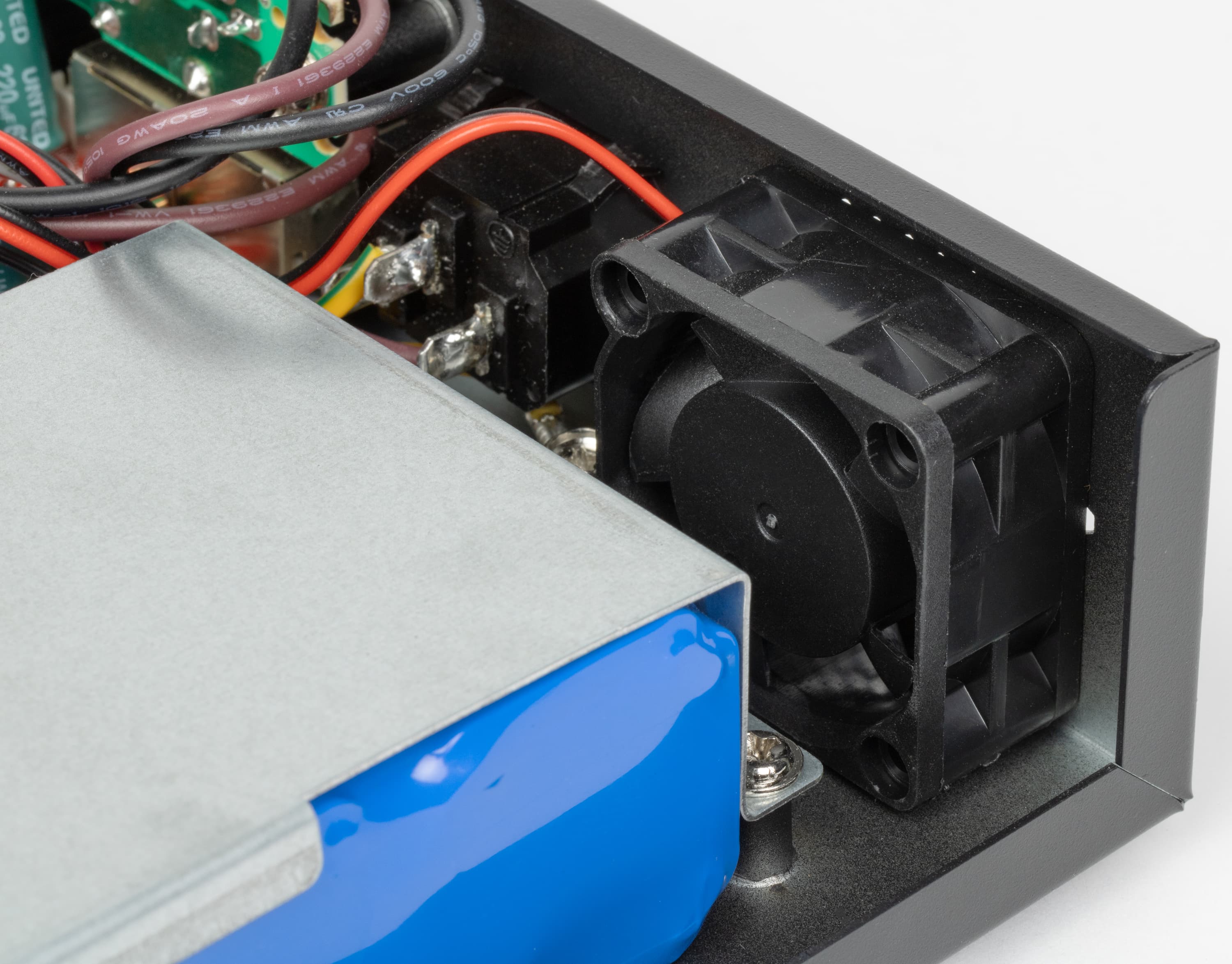 Он работает не постоянно: на несколько секунд задействуется при включении ИБП кнопкой, а потом в большинстве режимов бездействует, запускаясь лишь в случаях очень существенных нагрузок. Прорези для доступа воздуха расположены на левом боку корпуса возле радиаторов силовых элементов, то есть охлаждаются в первую очередь они.