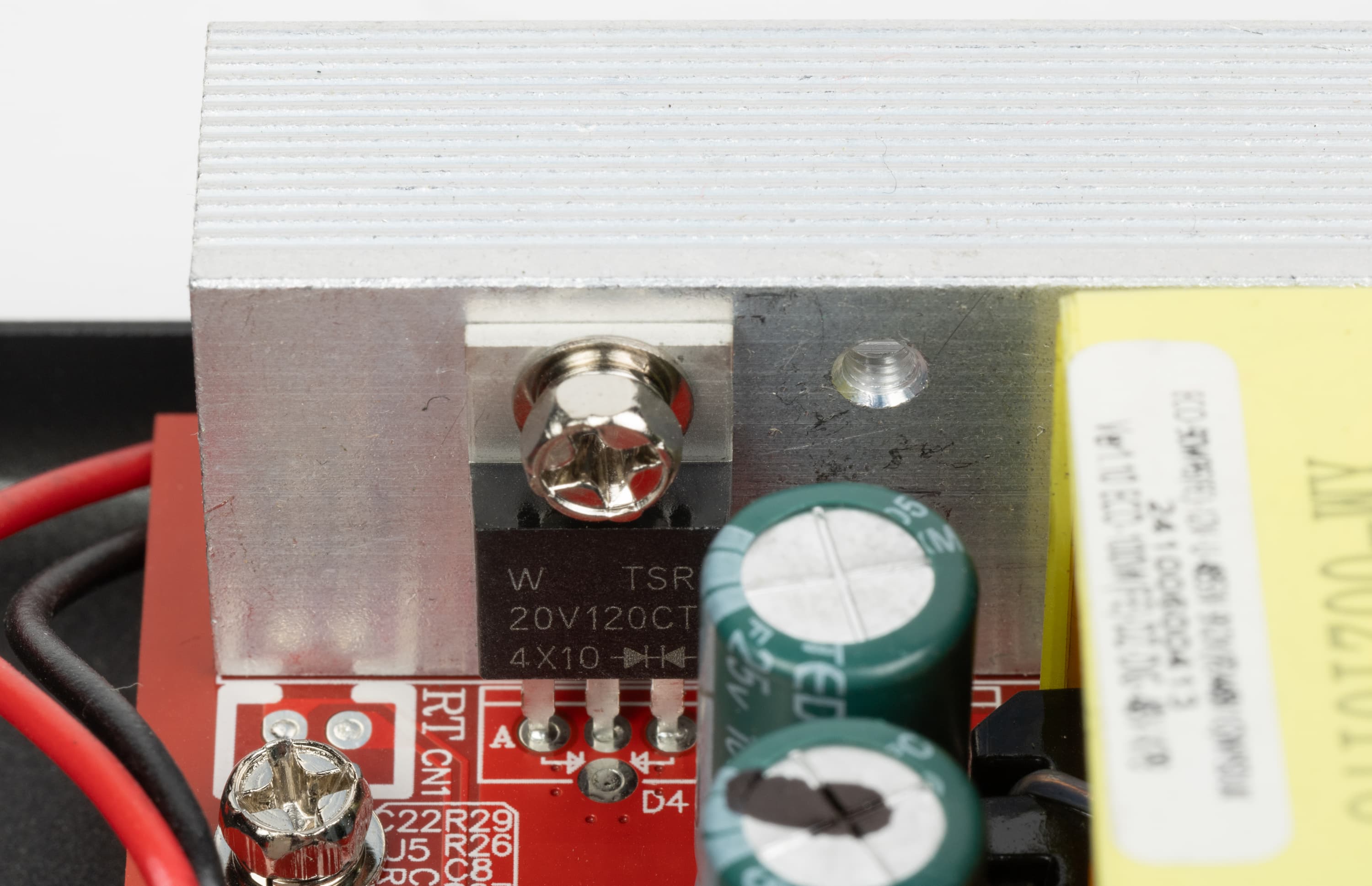Выпрямитель и мощный полевой транзистор NCE65T260F входного преобразователя AC/DC установлены на алюминиевом ребристом радиаторе, на втором подобном радиаторе установлена сборка из двух мощных диодов Шоттки TSR 20V120CT.