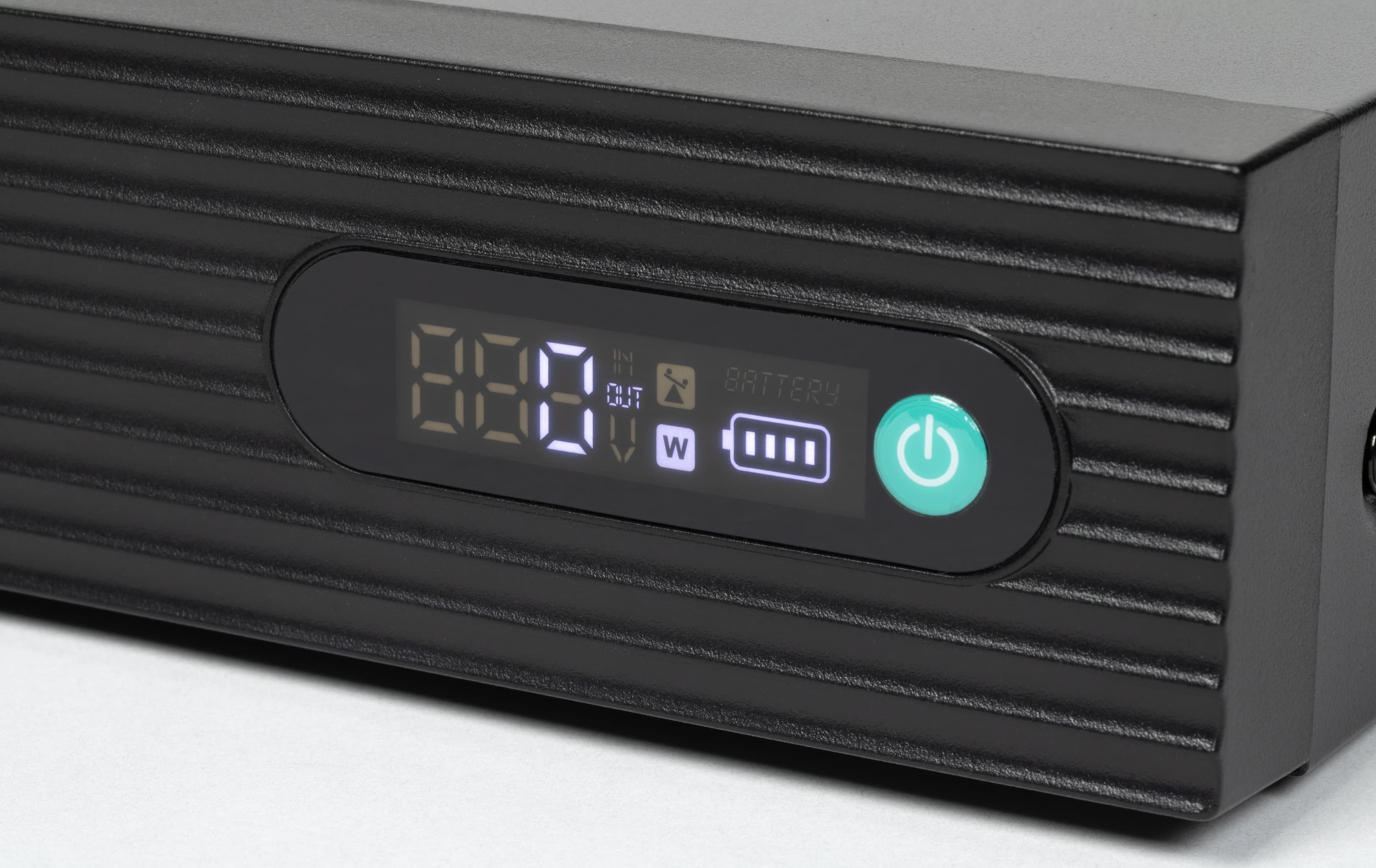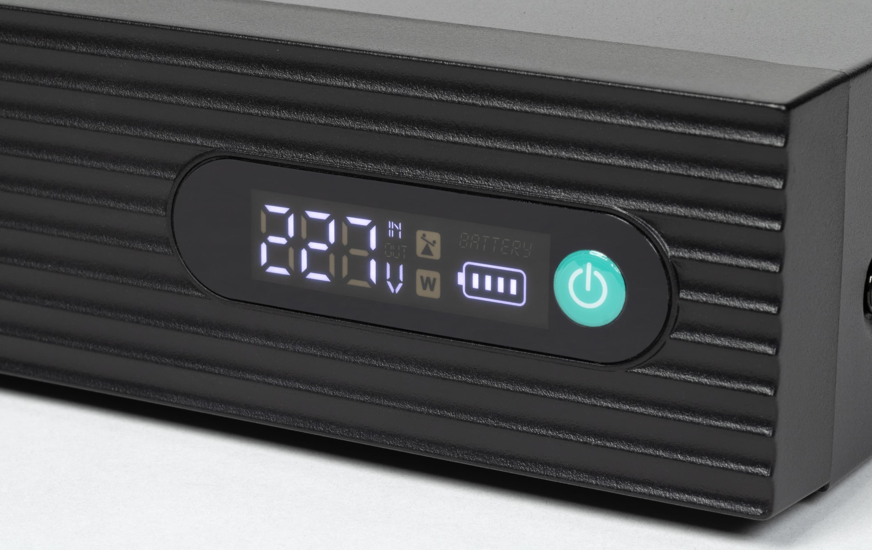 Длительное (около 2 секунд) нажатие кнопки включает/выключает источник (точнее, задействует его выходы: заряд батареи идет в любом случае, требуется лишь подключение к сети переменного тока). Короткое нажатие при включенном ИБП переключает отображаемый на индикаторе параметр: суммарная выходная мощность (сопровождается дополнительными значками «Out» и «W») или напряжение на входе (значки «In» и «V»).