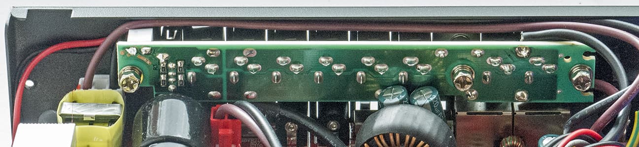 Эти семь выходов зрительно скомпонованы в две группы: два разъема, заметный промежуток, еще пять разъемов. Но никакой разницы между ними нет — все они соединены параллельно и распаяны на одной планке, а в промежутке изнутри находится один из крепежных винтов.