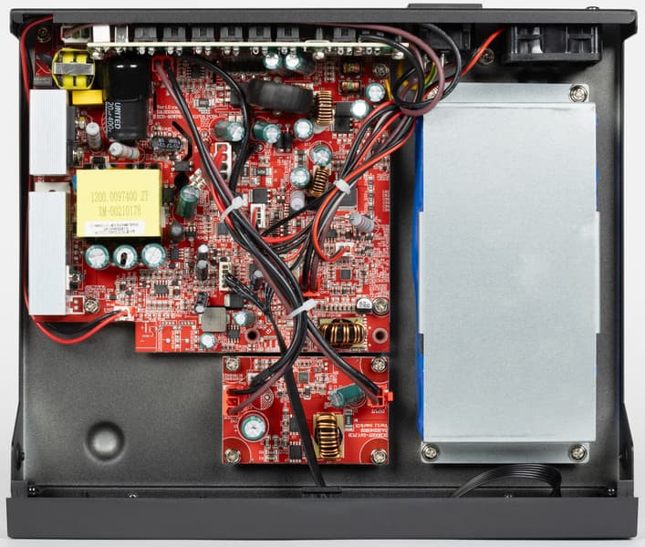 Внутри видим большую плату с управляющей и силовой электроникой, еще одну плату поменьше с элементами DC/DC-преобразователя, а также планку, на которой распаяны разъемы верхнего ряда.