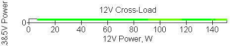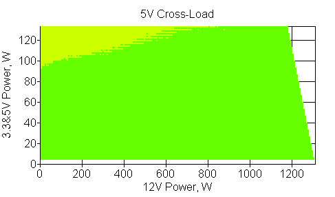 Следующим этапом инструментального тестирования является построение кросснагрузочной характеристики (КНХ) и представление ее на четвертьплоскости, ограниченной максимальной мощностью по шине 3,3&5 В с одной стороны (по оси ординат) и максимальной мощностью по шине 12 В с другой (по оси абсцисс). В каждой точке измеренное значение напряжения обозначается цветовым маркером в зависимости от отклонения от номинального значения.