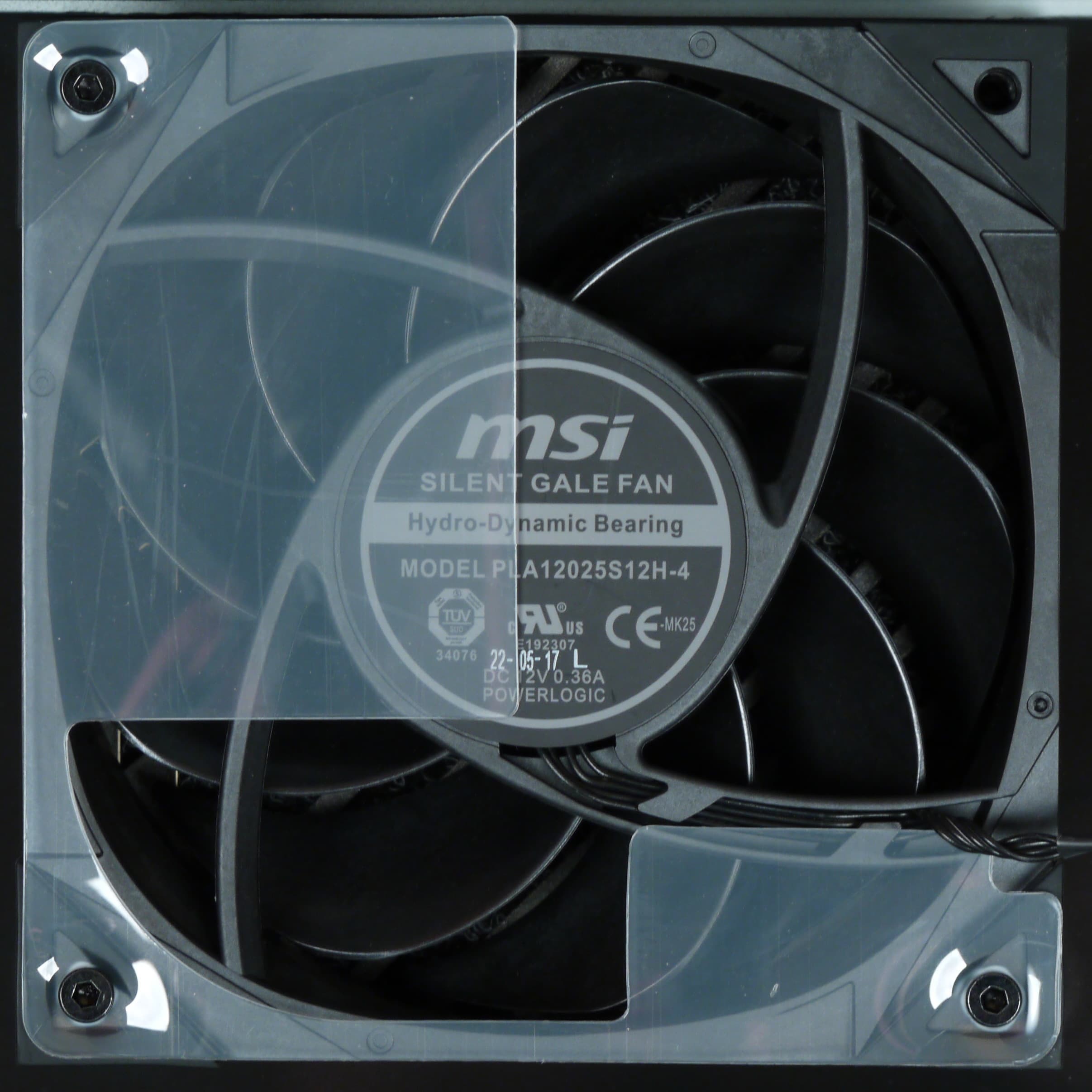 В блоке питания установлен вентилятор PLA12025S12H-4, основанный на гидродинамическом подшипнике и изготовленный компанией Powerlogic. Подключение вентилятора — разъемное, трехпроводное, что указывает на наличие ШИМ-управления вентилятором.