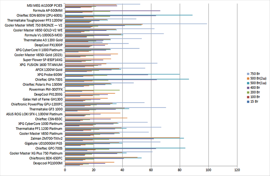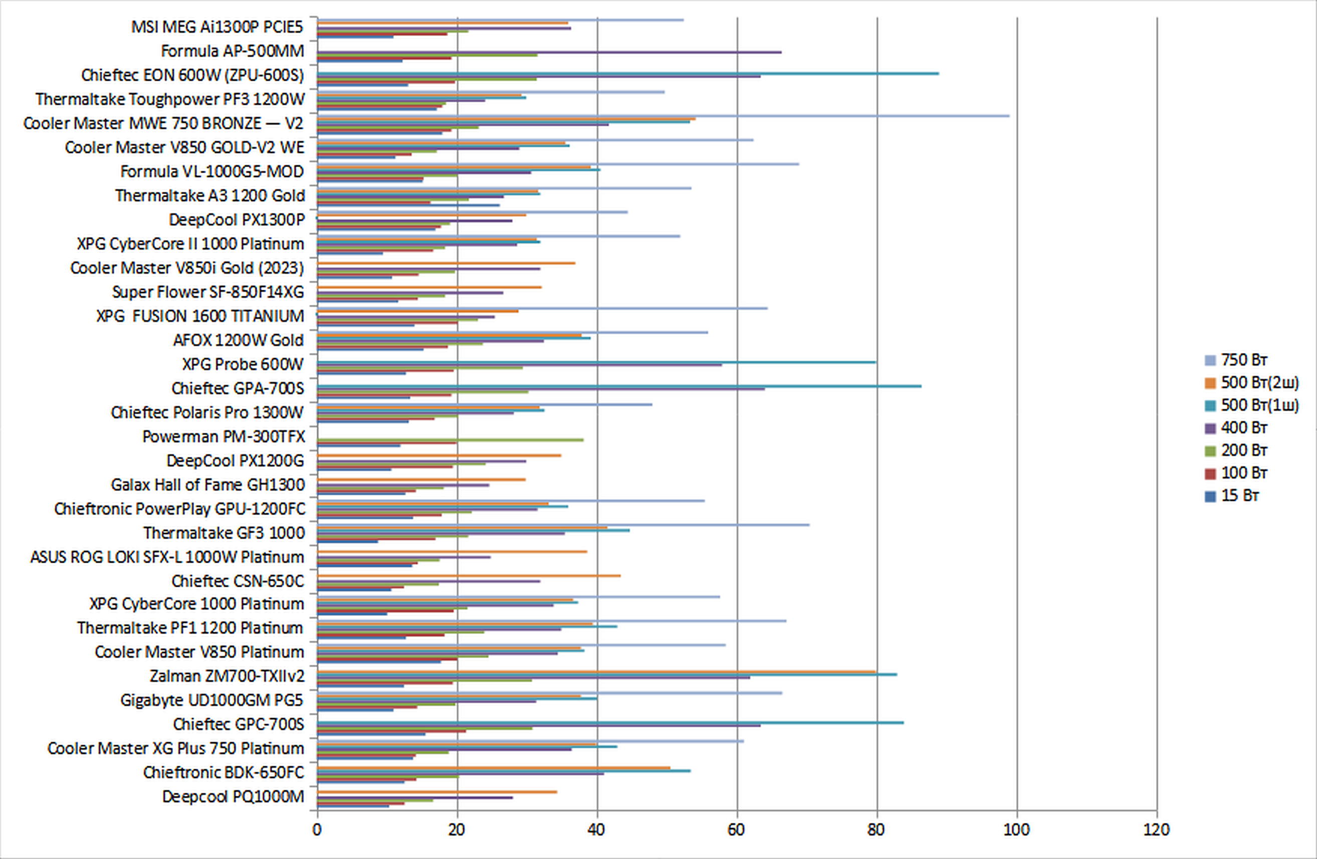| Chieftec Polaris Pro 1300W | 13,2 | 16,9 | 20,3 | 28,2 | 32,6 | 31,9 | 48,0 |