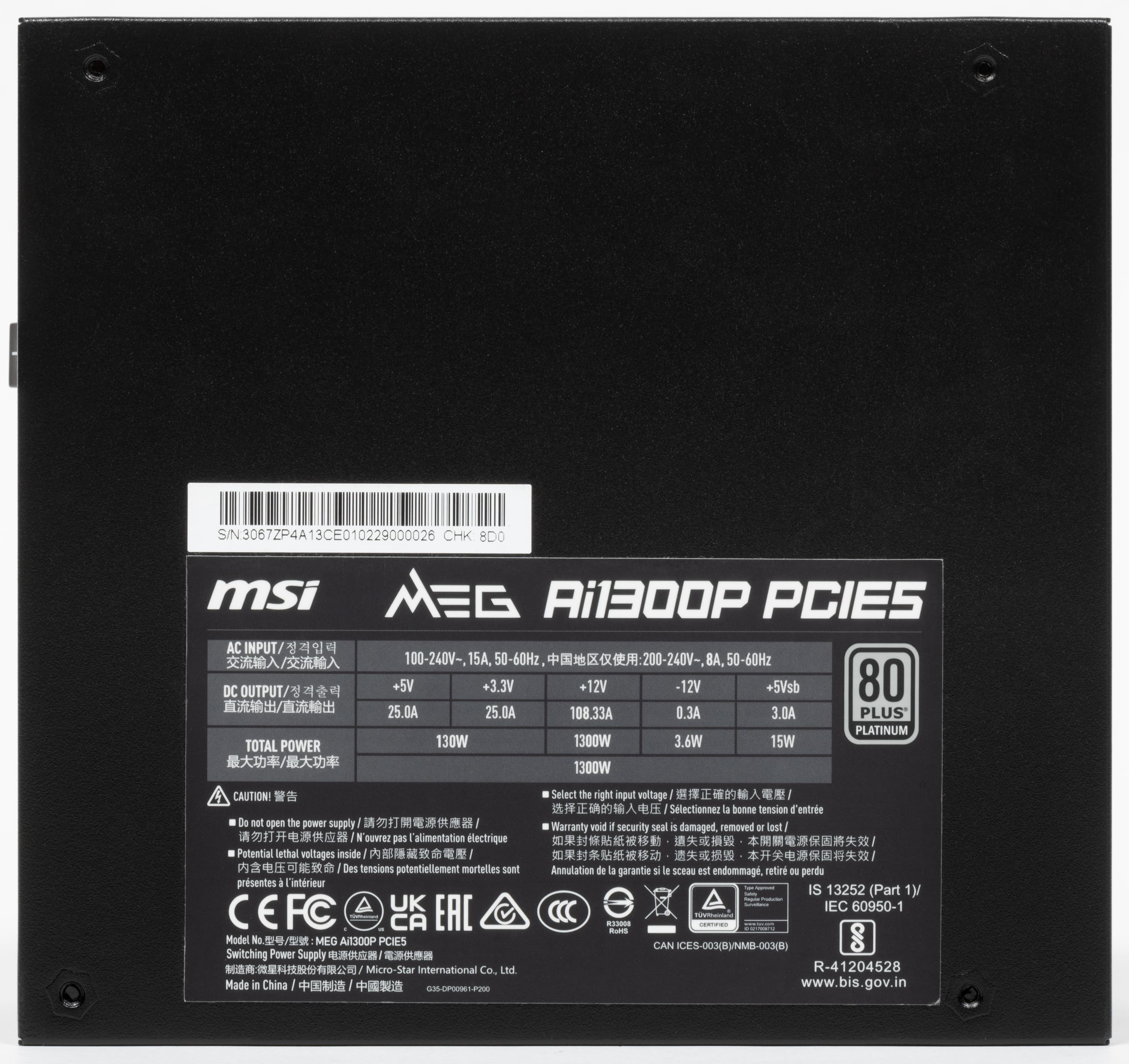 Все необходимые параметры указаны на корпусе блока питания в полном объеме, для мощности шины +12VDC заявлено значение 1300 Вт. Соотношение мощности по шине +12VDC и полной мощности составляет 100%, что, разумеется, является отличным показателем.