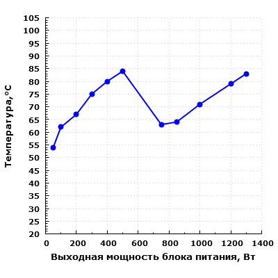 Все основные тесты проводились в гибридном режиме по умолчанию. Термонагруженность конденсаторов при работе на мощности от 300 Вт до 500 Вт и свыше 1200 Вт довольно высокая (свыше 75 градусов), но ее можно считать удовлетворительной.